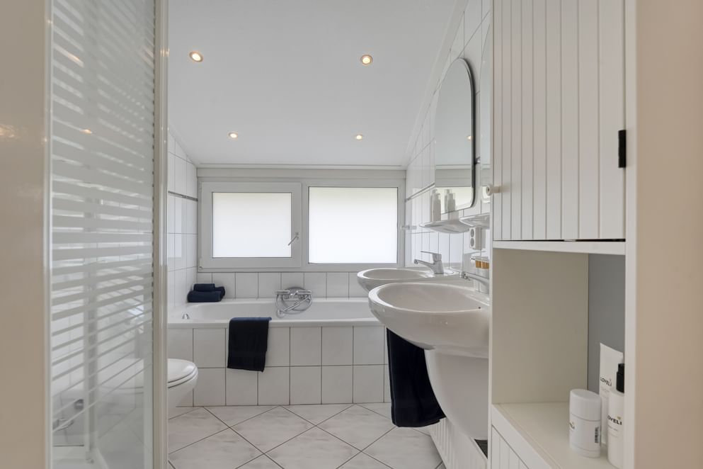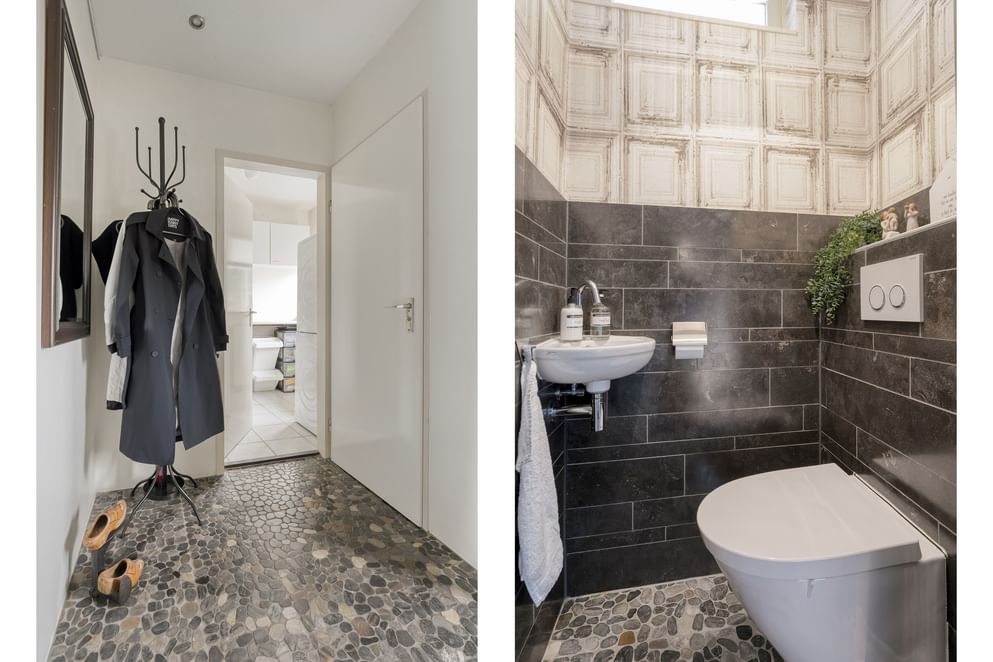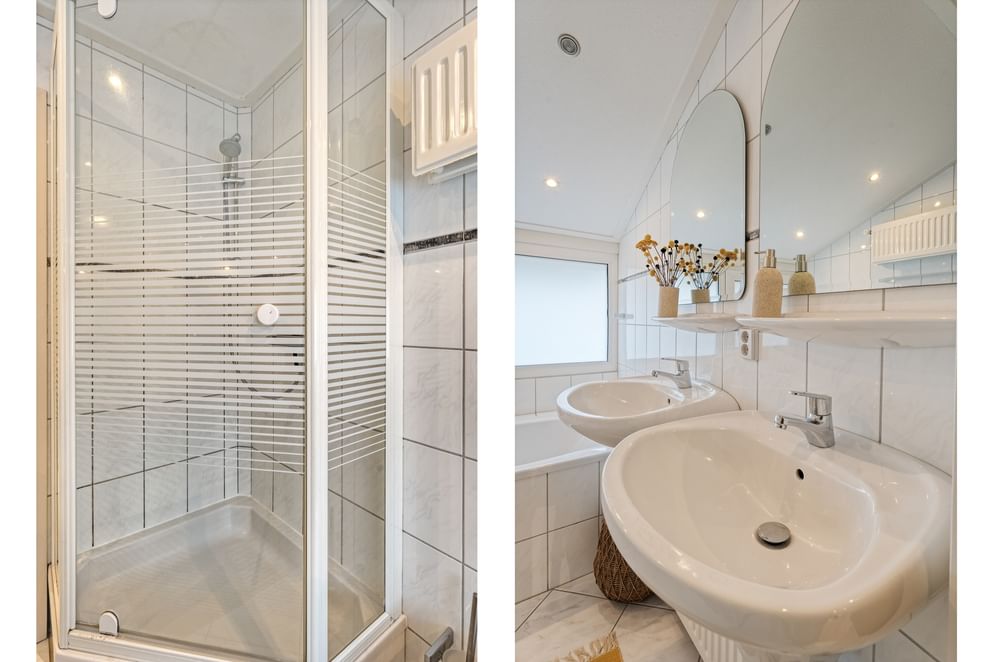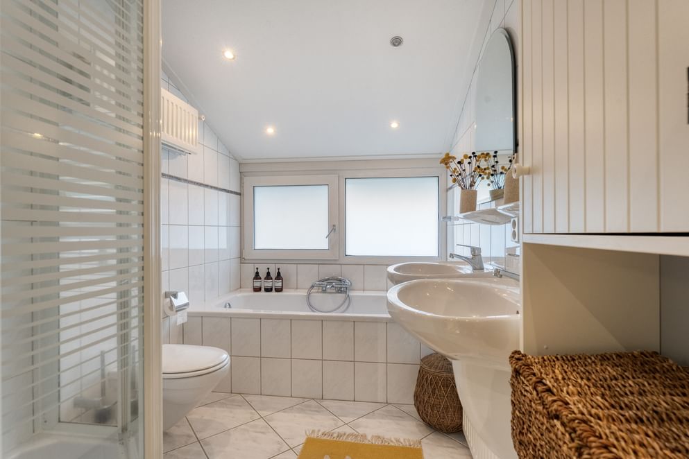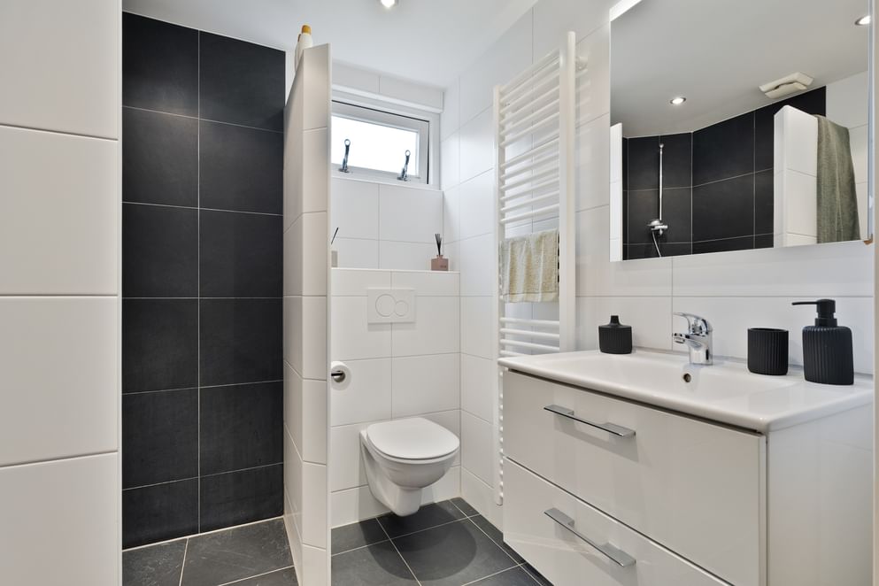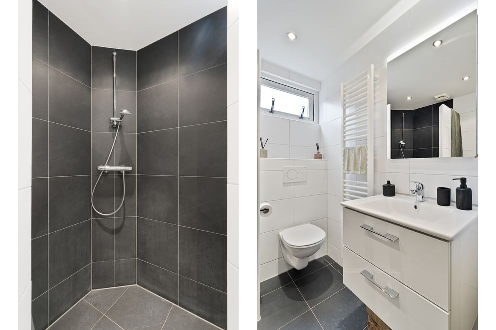 • een stijlvolle badkamer met inloopdouche, wastafelmeubel, zwevend toilet en witgoedaansluiting,