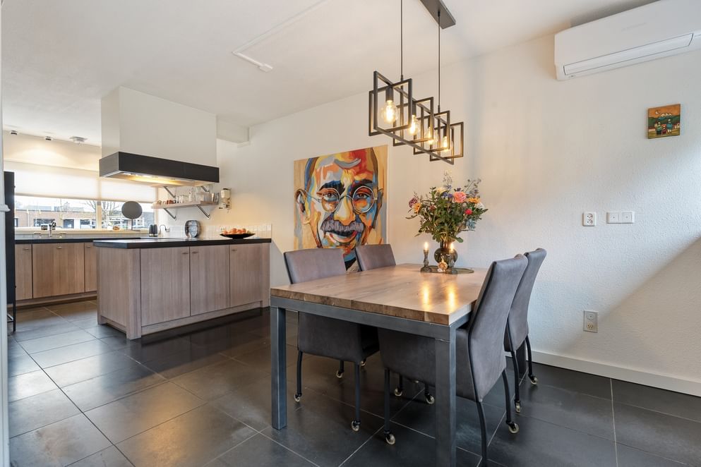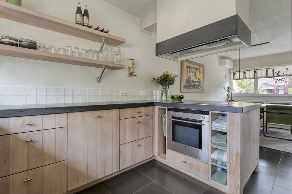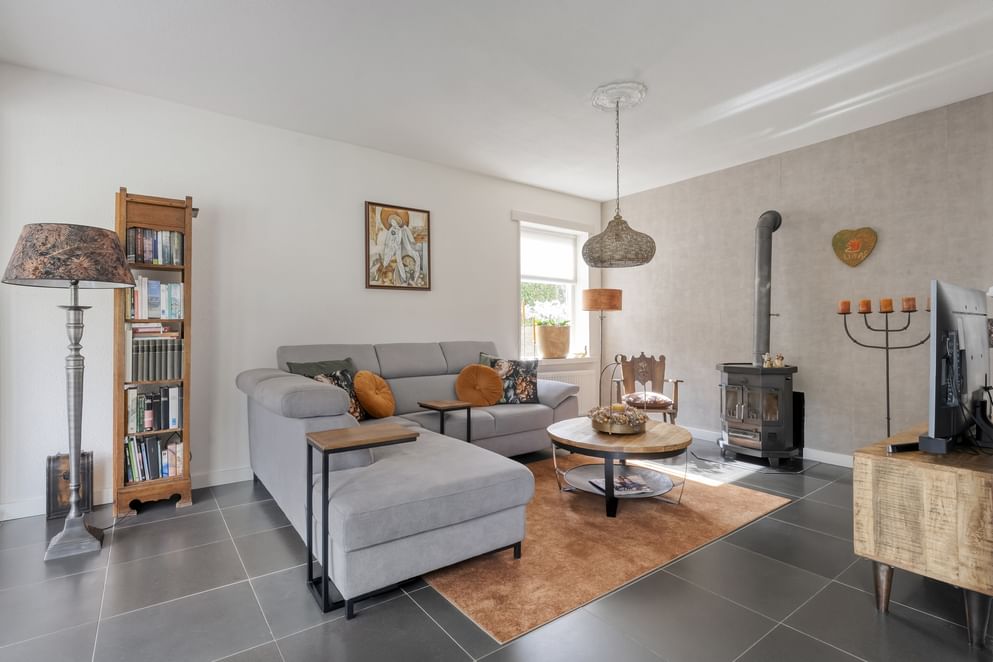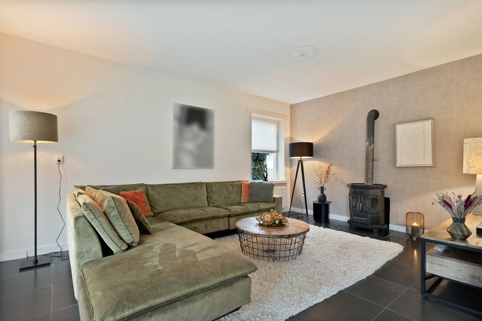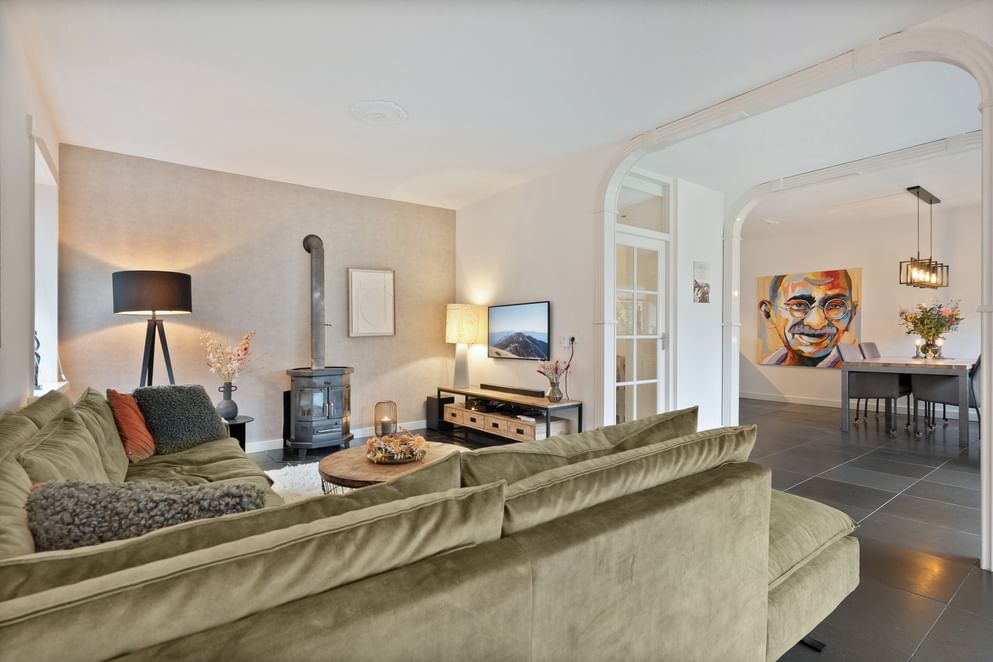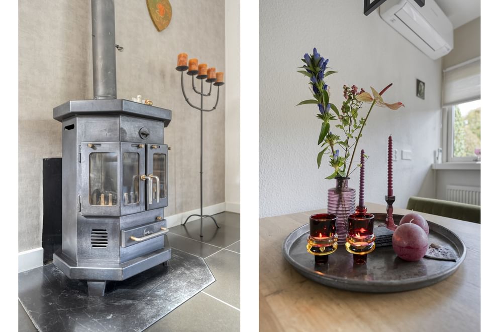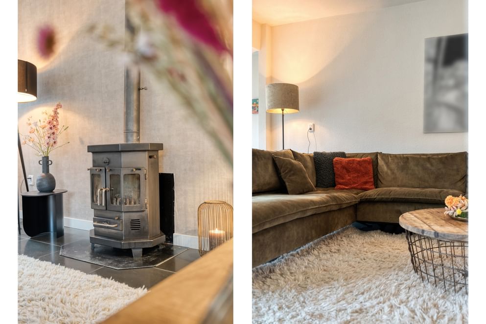 De hoofdwoning straalt comfort en kwaliteit uit. Op de begane grond vind je een ruime woonkamer met vloerverwarming, een sfeervolle allesbrander en een handgemaakte keuken met hoogwaardige inbouwapparatuur. De openslaande deuren zorgen voor veel licht en direct contact met de tuin.