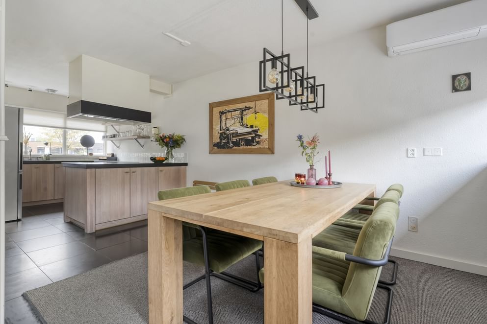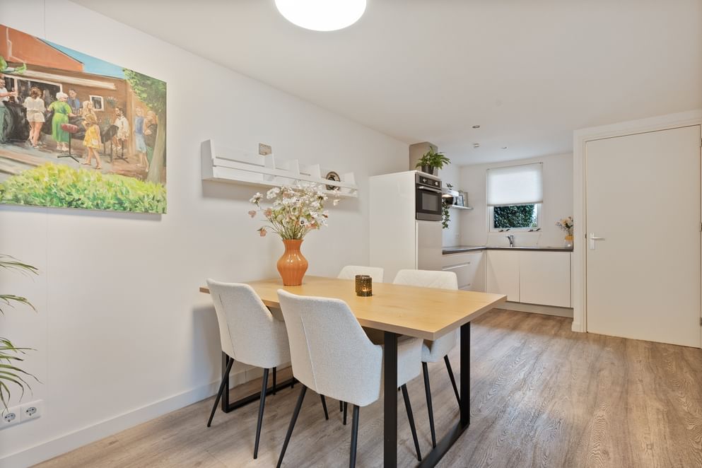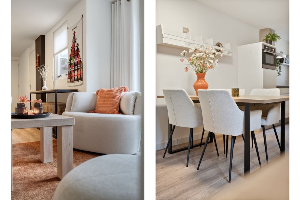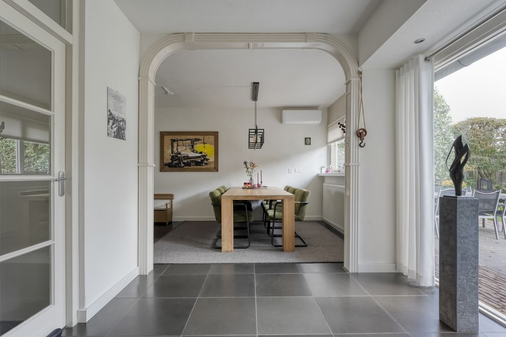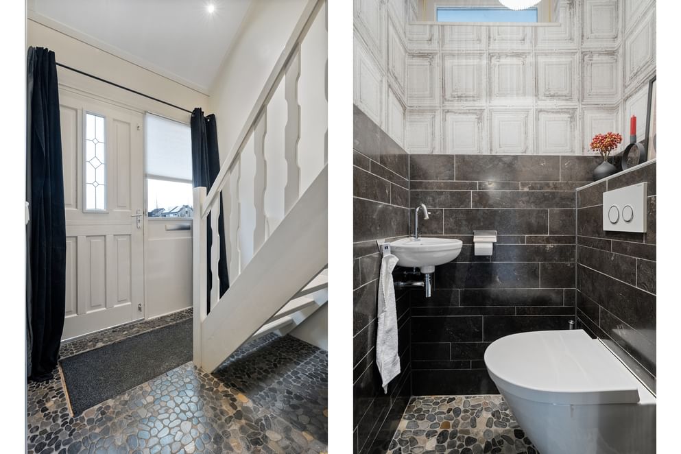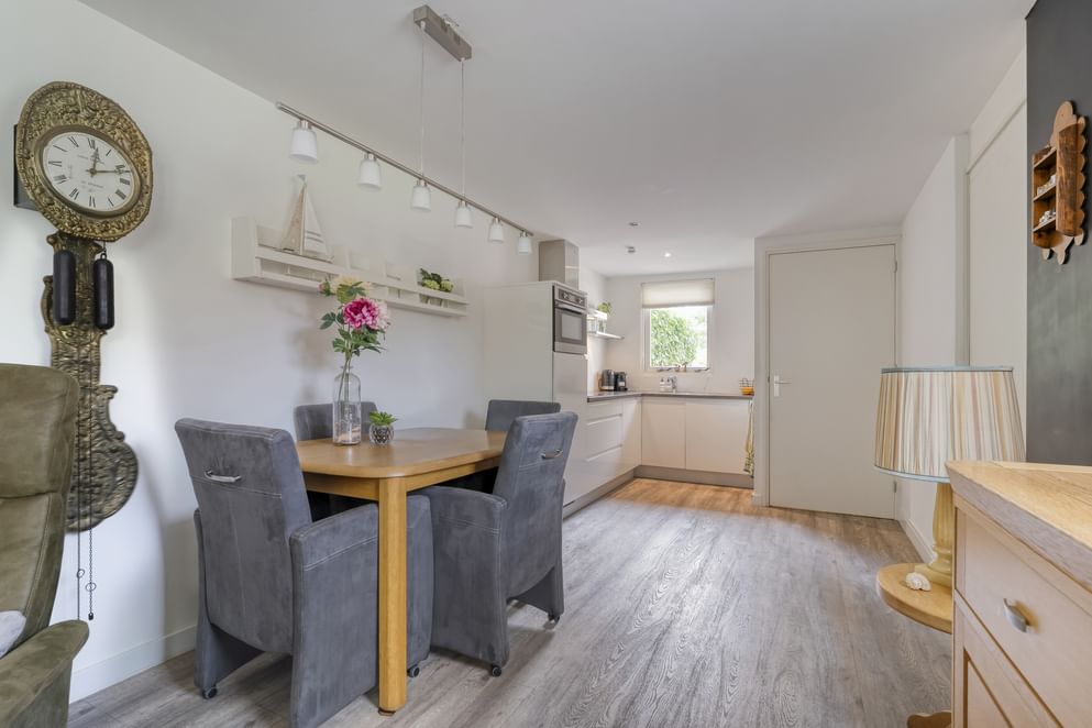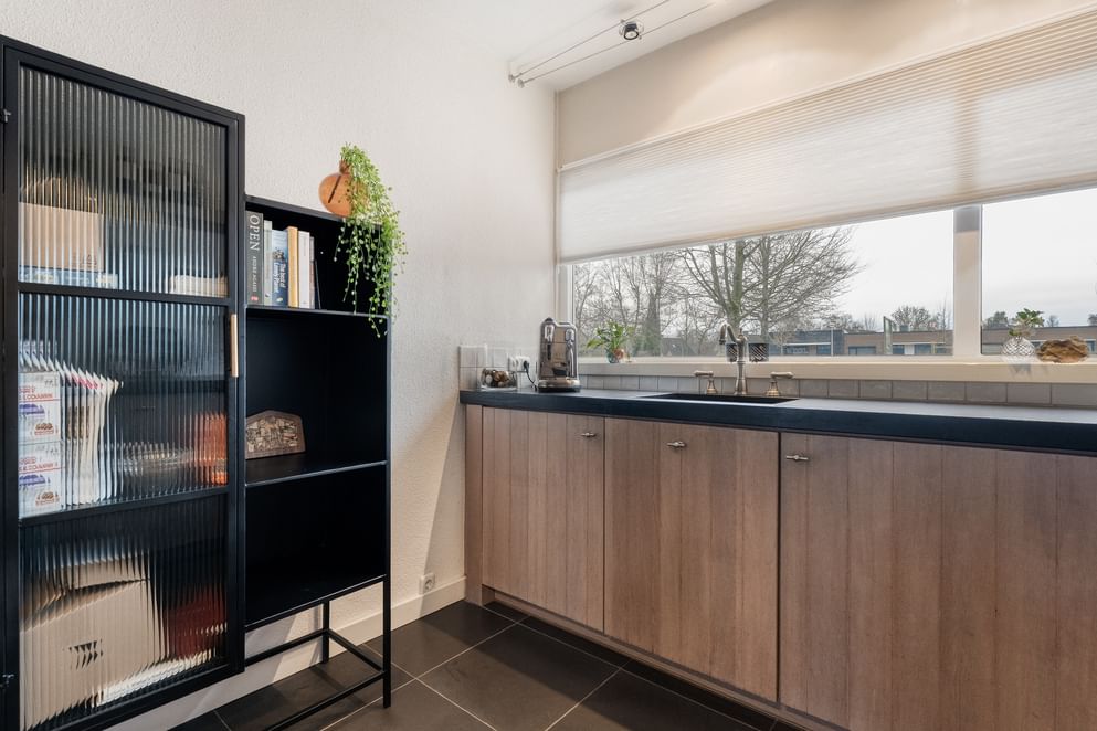 De hoofdwoning straalt comfort en kwaliteit uit. Op de begane grond vind je een ruime woonkamer met vloerverwarming, een sfeervolle allesbrander en een handgemaakte keuken met hoogwaardige inbouwapparatuur. De openslaande deuren zorgen voor veel licht en direct contact met de tuin.
