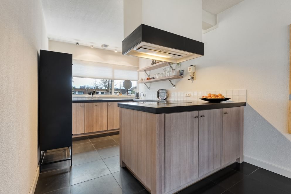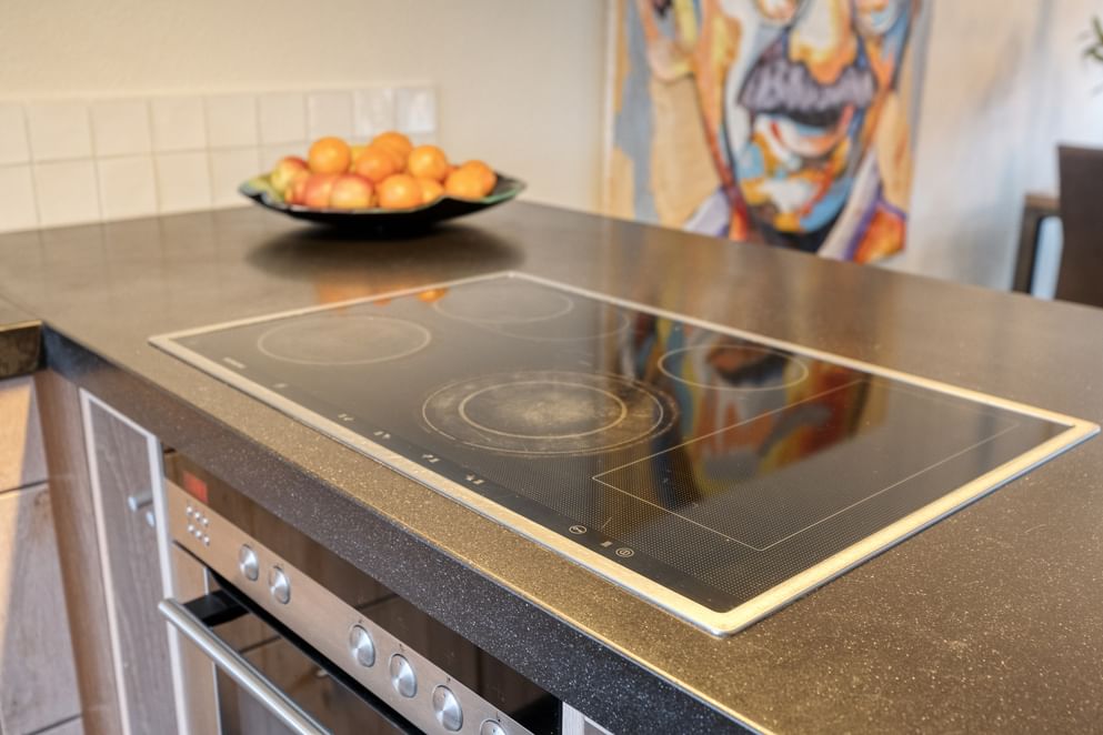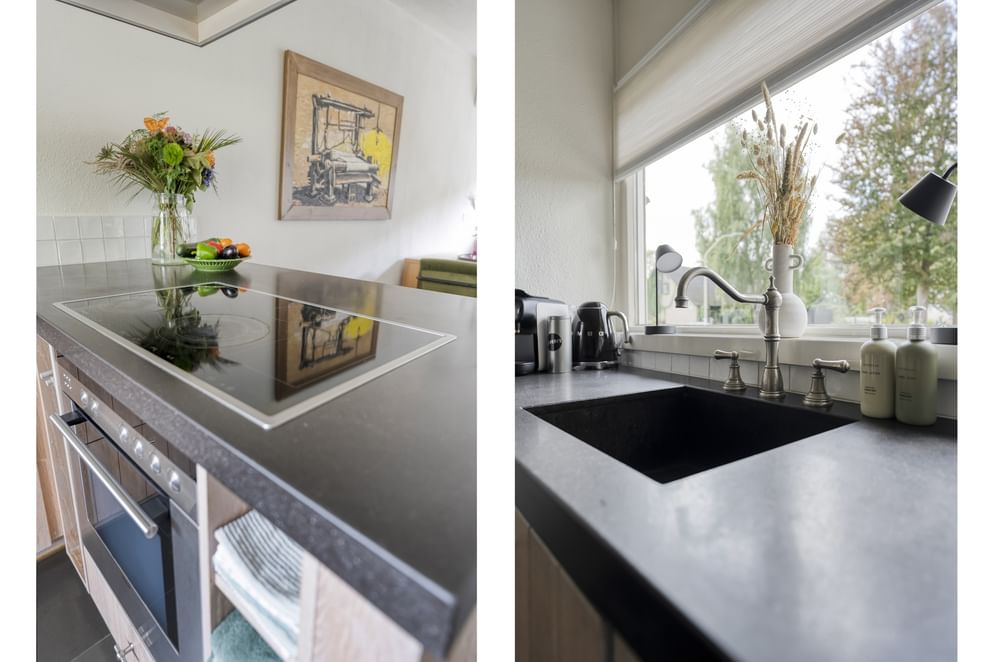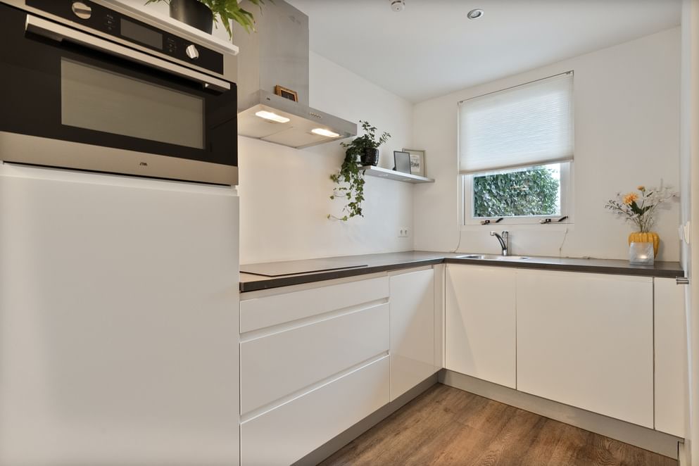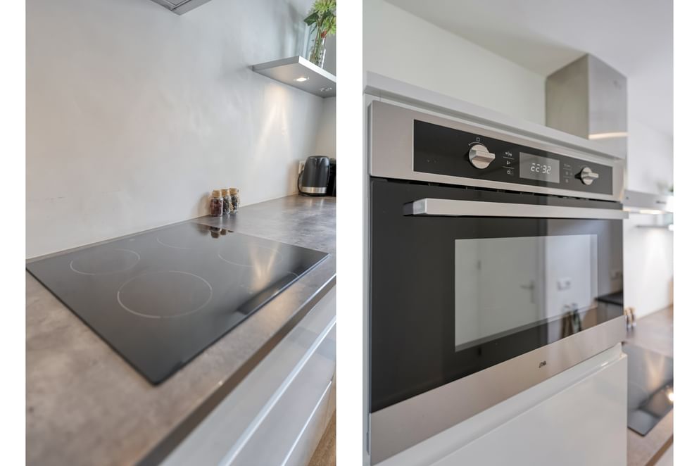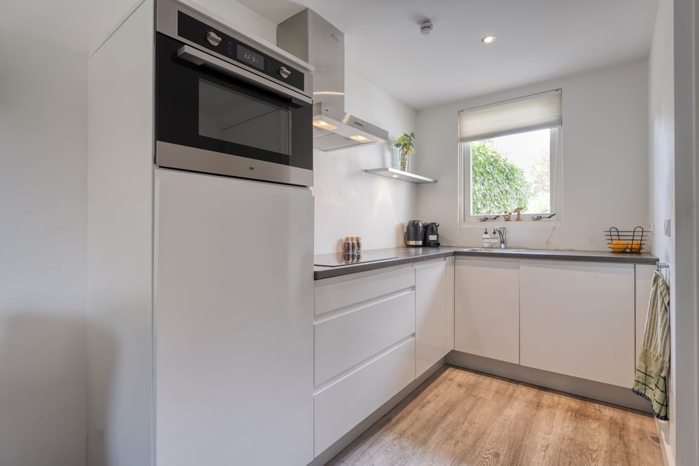 • een moderne keuken met combi-oven, koelkast, inductieplaat, afzuiging en spoelbak,