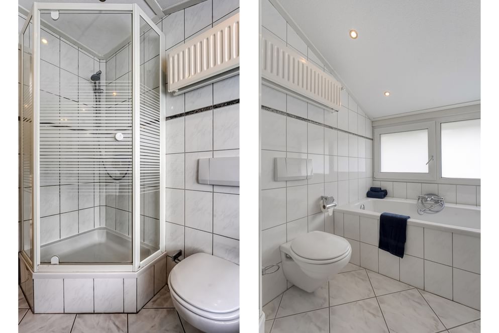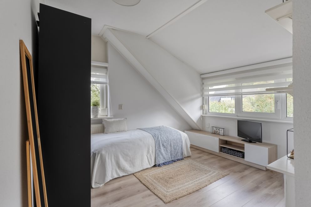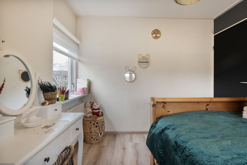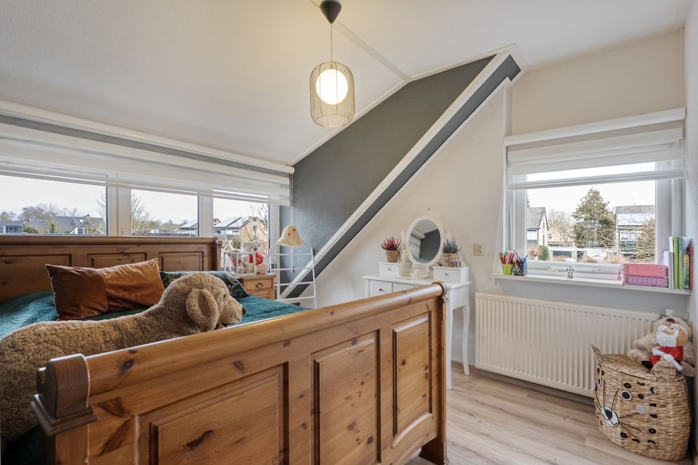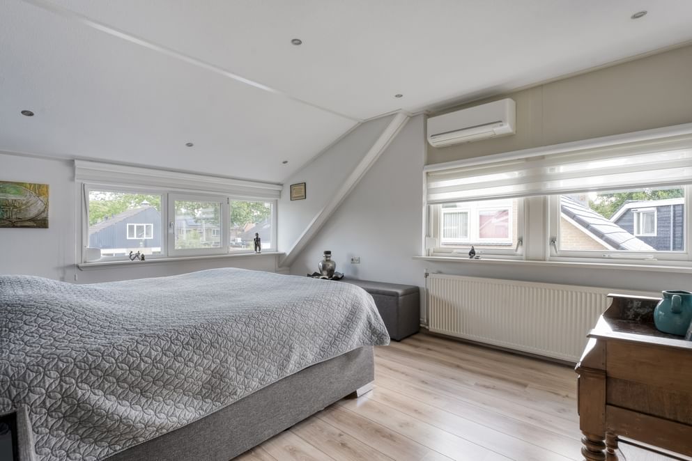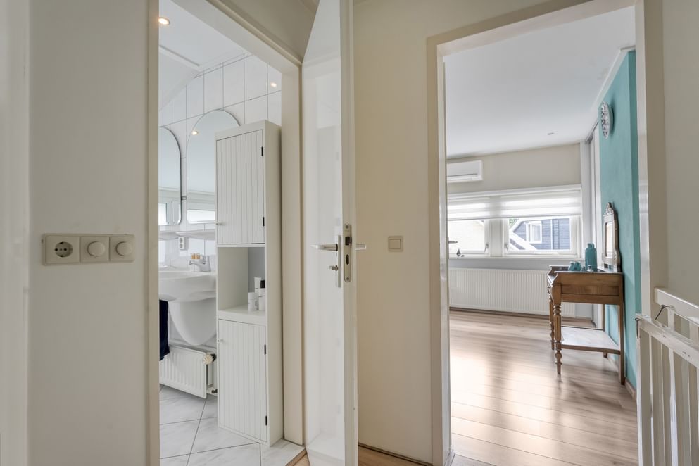 Op de eerste verdieping bevinden zich drie ruime slaapkamers, voorzien van rolluiken en dakisolatie. De complete badkamer beschikt over een ligbad, douche, dubbele wastafel en elektrische vloerverwarming.
