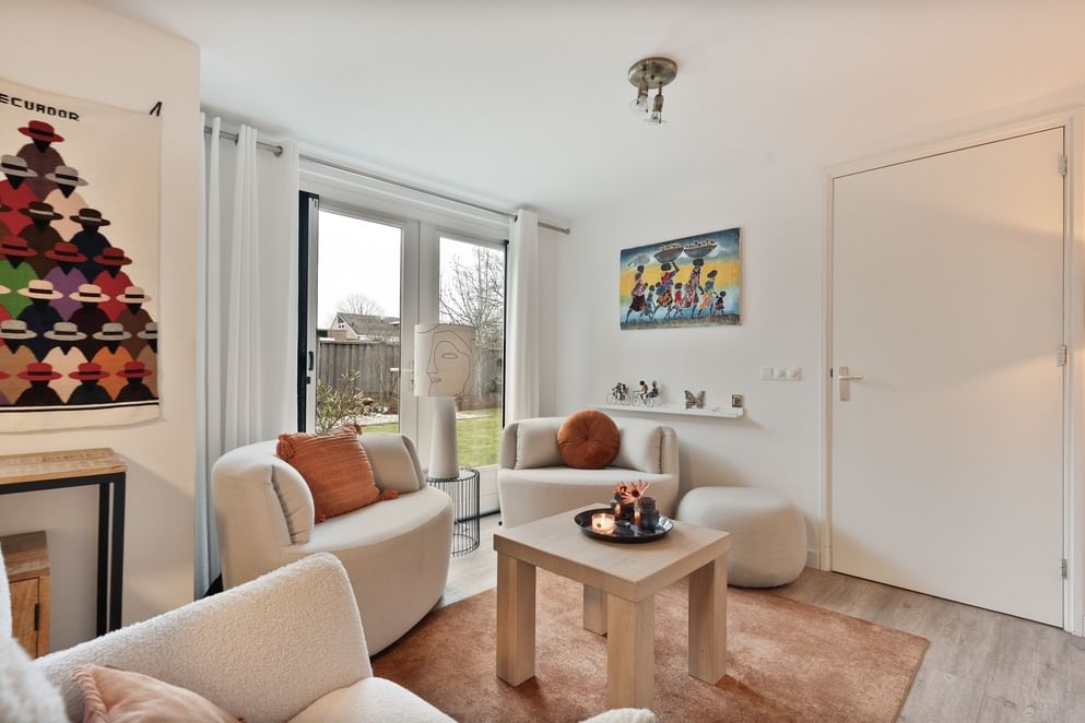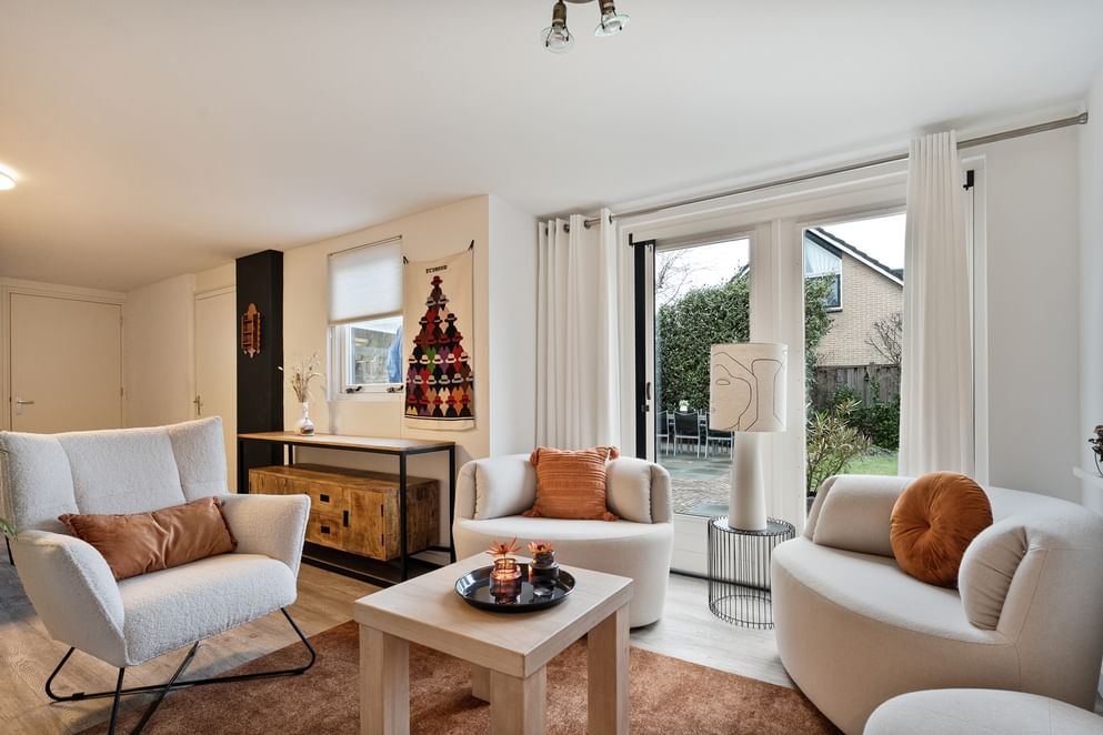 • een eigen woonkamer met vloerverwarming en openslaande tuindeuren,