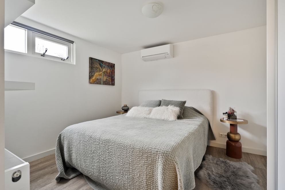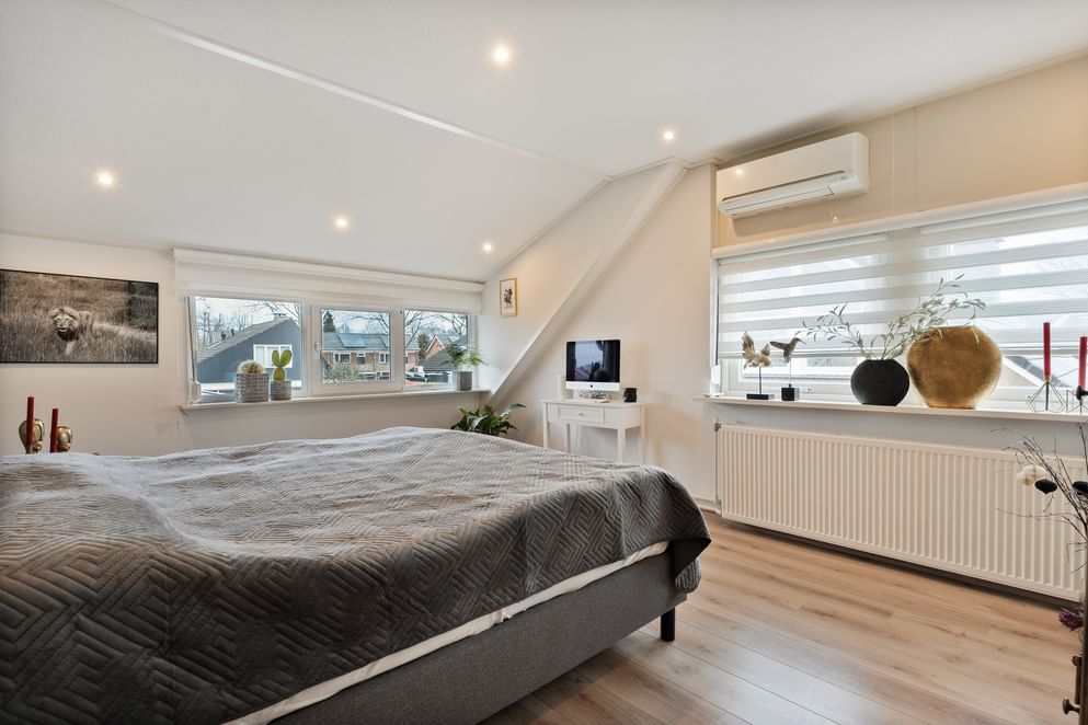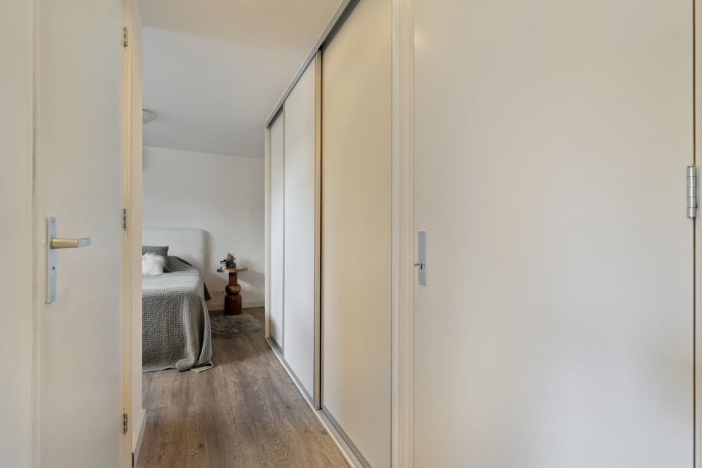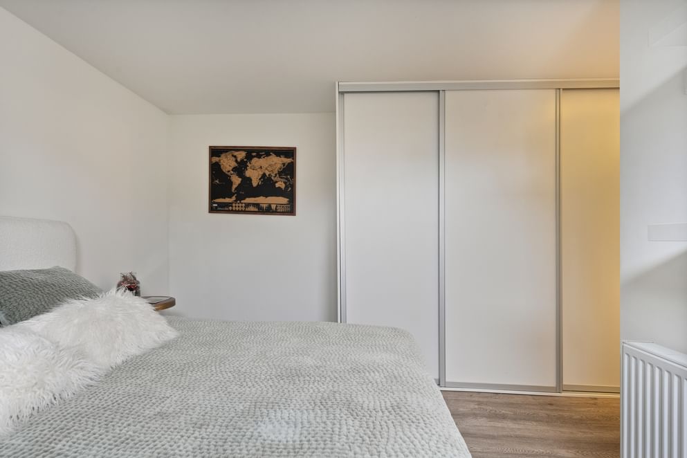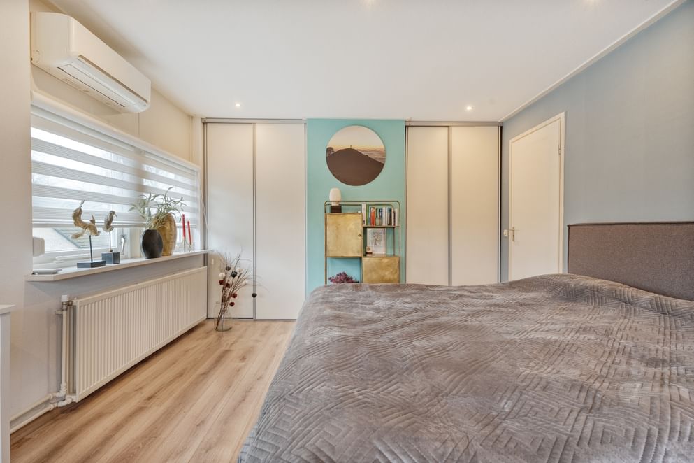 • een ruime slaapkamer met vaste kasten en airco.
