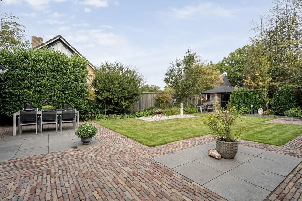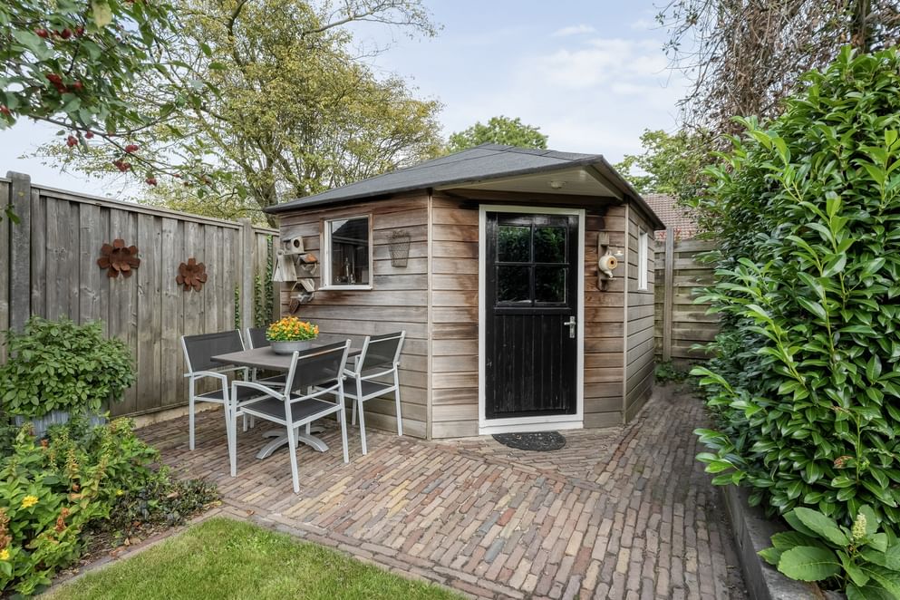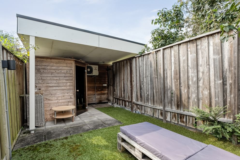 De strak aangelegde tuin is voorzien van buitenverlichting en een zijpoort. Onder de overkapping bevindt zich de Finse sauna – dé plek om heerlijk te ontspannen. Achterin de tuin staat een praktische berging. In 2024 is de volledige buitenzijde geschilderd.
