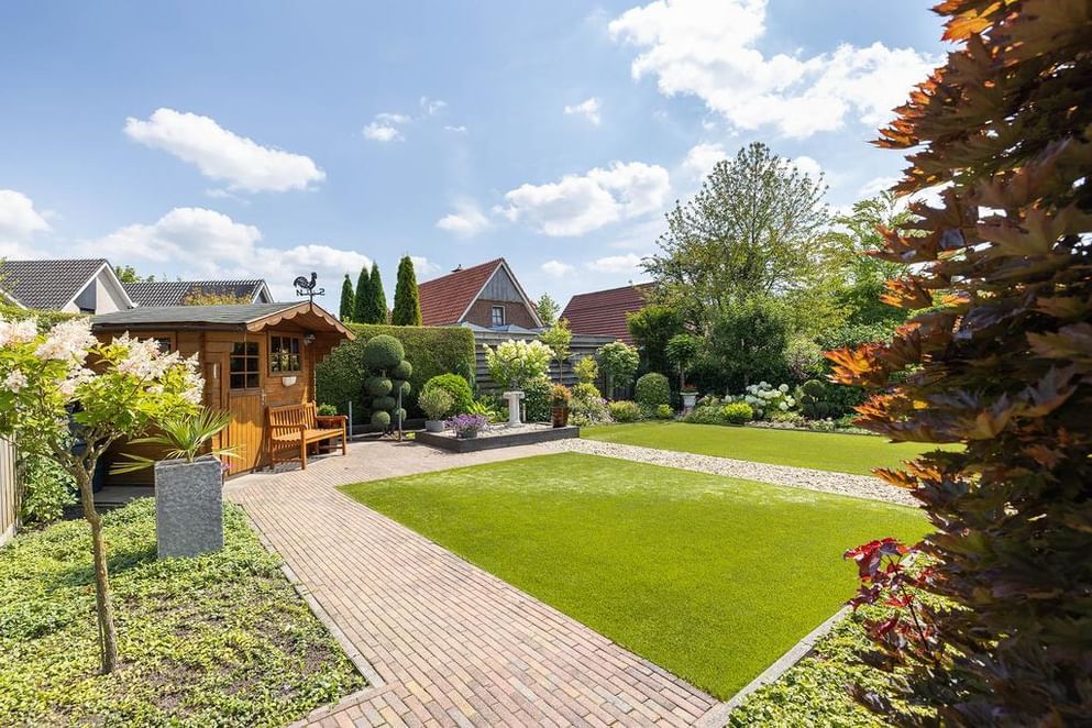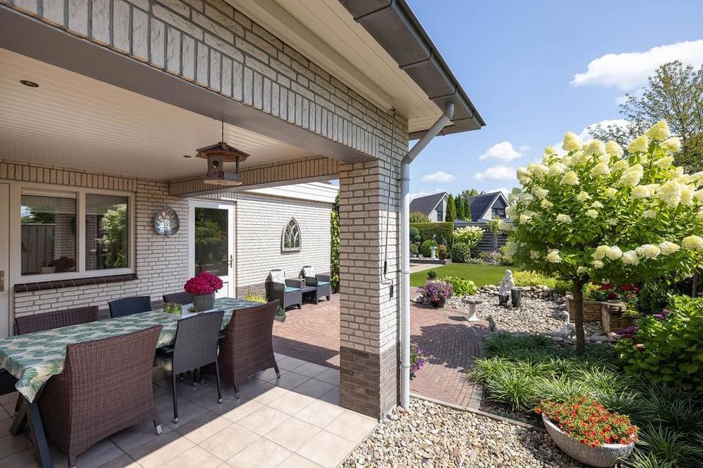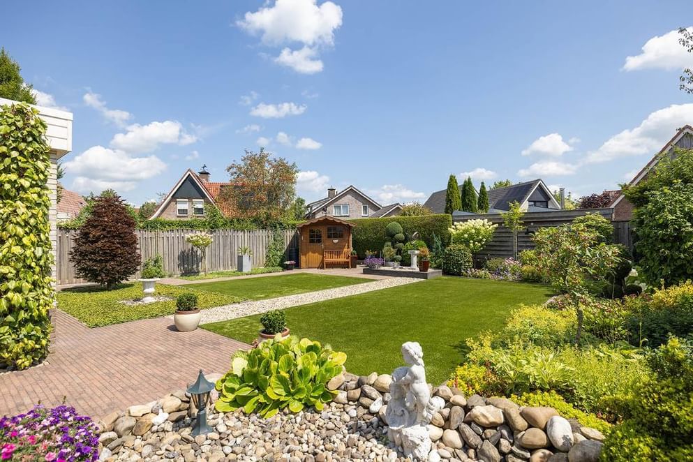 De zonnige en fraai aangelegde tuin is een waar pluspunt van deze woning. De voortuin straalt netheid en symmetrie uit, terwijl de achtertuin volop privacy biedt met veel groen, sierbestrating en een overdekt terras. Dit overdekte terras is deels beglaasd en vormt een heerlijke plek om van de tuin te genieten, ongeacht het weer. Er is een achterom aanwezig.