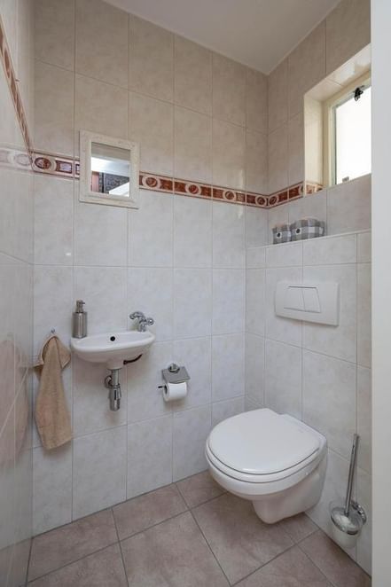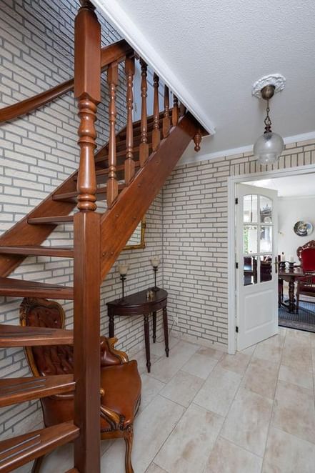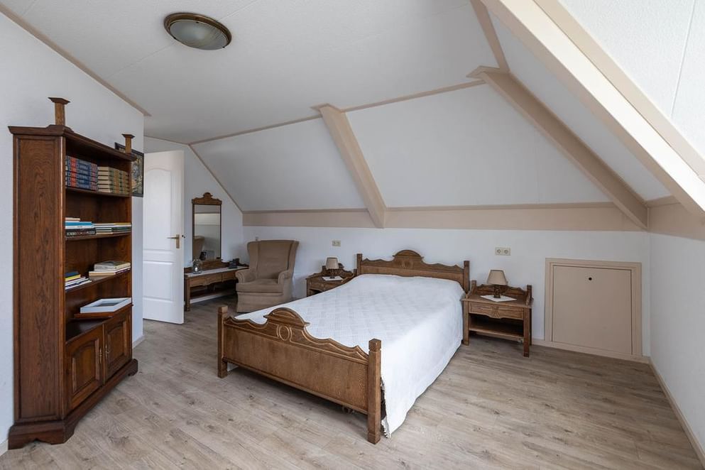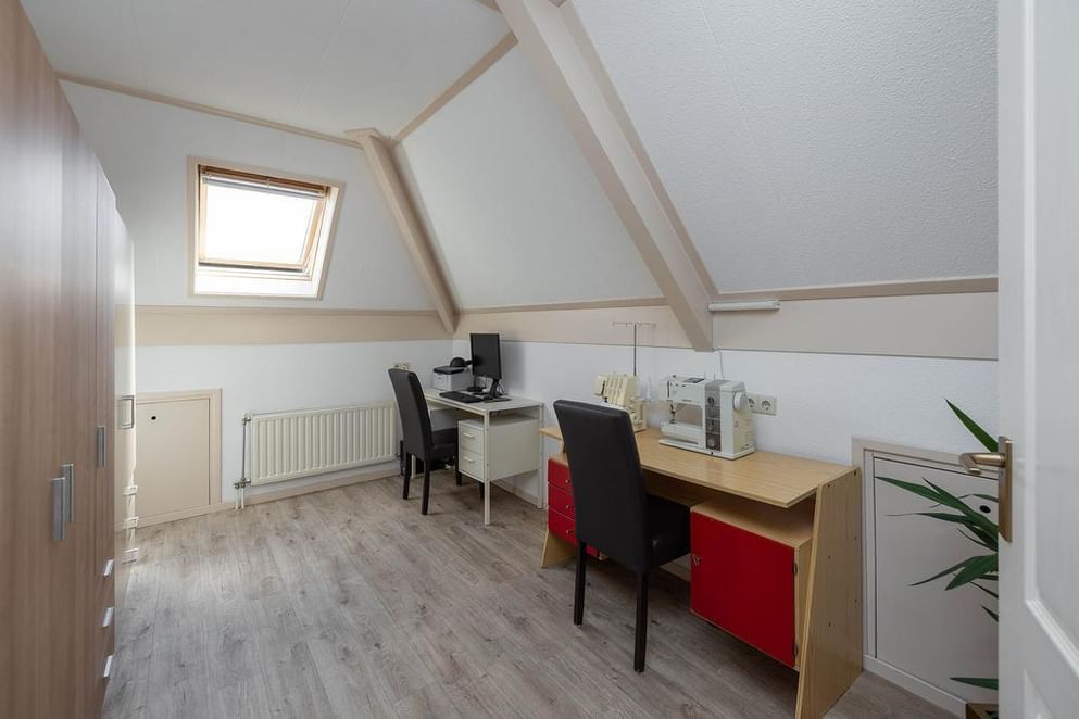 Via de trap in de hal bereik je de overloop op de eerste verdieping. Hier bevinden zich een inloopkast en twee extra kamers: een compacte slaapkamer met dakkapel en een ruime tweede slaapkamer met Velux dakraam aan de achterzijde. Daarnaast is er een tweede badkamer met douche, toilet en dakraam. Dankzij de dakvorm en dakkapel biedt ook deze verdieping volop licht en ruimte.