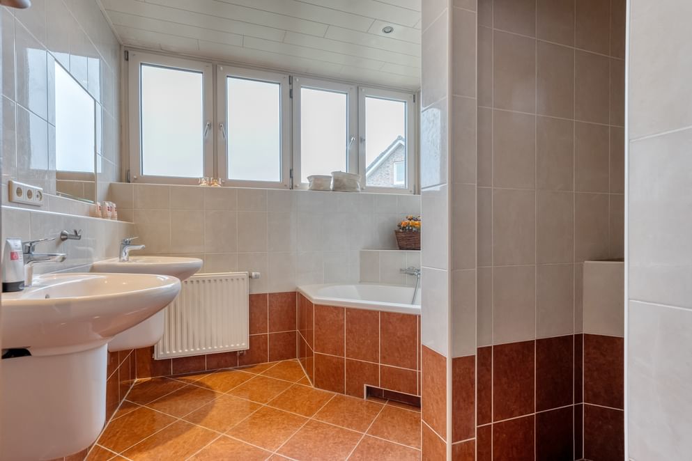 De overloop voorzien van een airco biedt toegang tot drie slaapkamers, de badkamer, een separaat toilet en een wasruimte. Deze slaapkamers zijn voorzien van vaste kasten. De badkamer is traditioneel afgewerkt en uitgerust met een dubbele wastafel, ligbad en inloopdouche. Via de overloop bereik je tevens een tweede overloop-/hal, die toegang biedt tot een vierde slaapkamer en een berging.