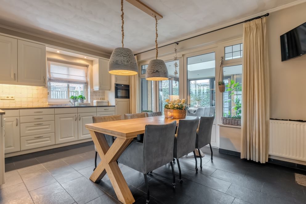 Via de voordeur stap je binnen in de hal met het toilet, de meterkast en de trapopgang naar de eerste verdieping en de provisiekelder. Vanuit de hal bereik je de ruime en lichte woonkamer, die door de grote ramen een bijzonder ruimtelijk gevoel geeft. Aansluitend is de keuken gesitueerd, uitgerust met diverse inbouwapparatuur. De openslaande deuren bieden toegang tot de gezellige, volledig geïsoleerde serre — een stijlvolle en comfortabele plek om samen met vrienden en familie te genieten.