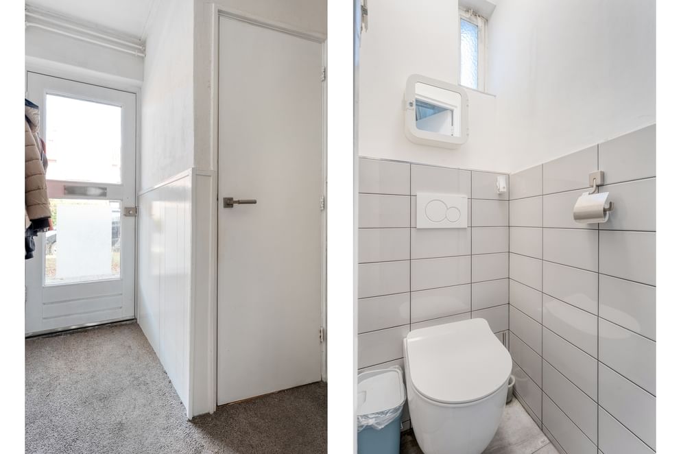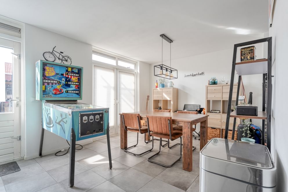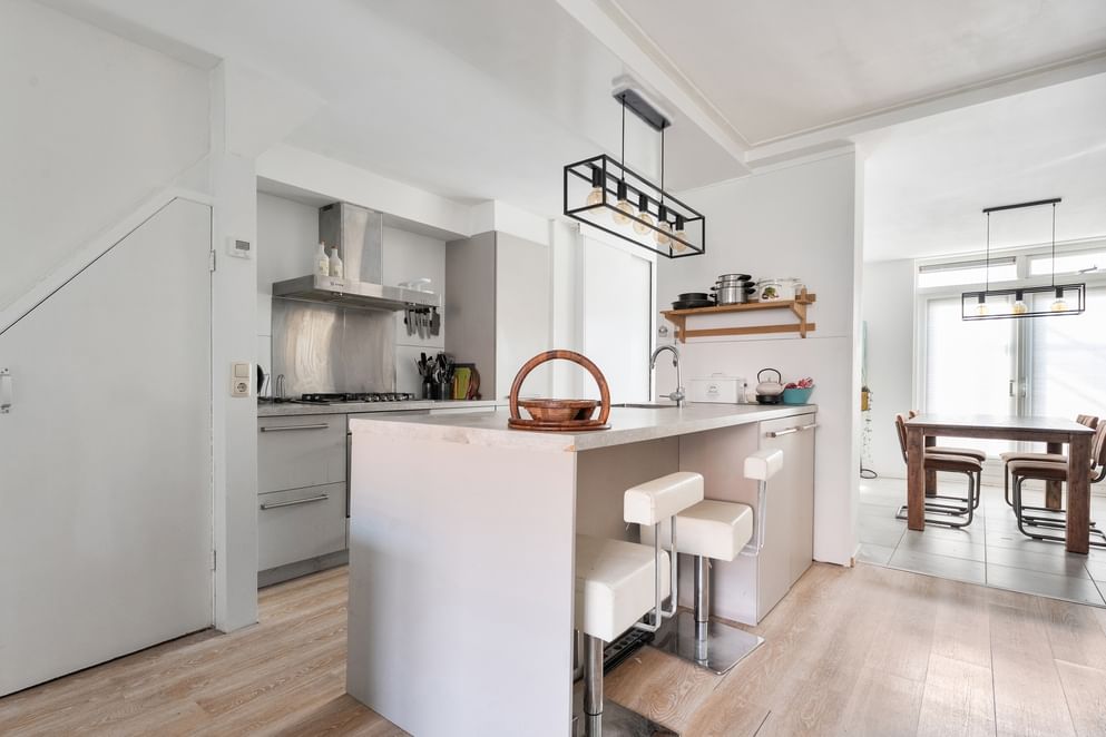 Bij binnenkomst kom je in de hal met een separaat toilet, trapopgang en handige trappenkast. Vanuit hier stap je de ruime keuken binnen, het centrale punt van de woning. De keuken is modern uitgevoerd en voorzien van een spoeleiland, grote koel-vriescombinatie, oven met gasfornuis en veel opbergruimte. De woonkamer bevindt zich aan de voorzijde van de woning en heeft een prettige lichtinval. Aan de achterzijde bevindt zich de uitbouw uit 2023, voorzien van openslaande tuindeuren en een vaste kast. Deze ruimte biedt volop mogelijkheden voor een grote eettafel of extra zithoek en vormt een mooi geheel met de tuin.