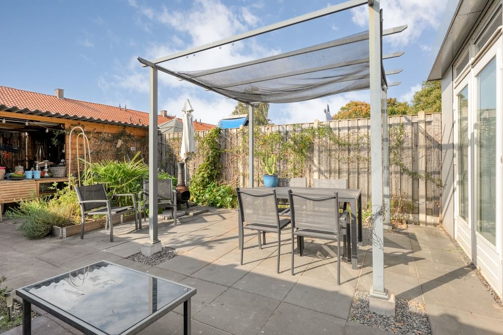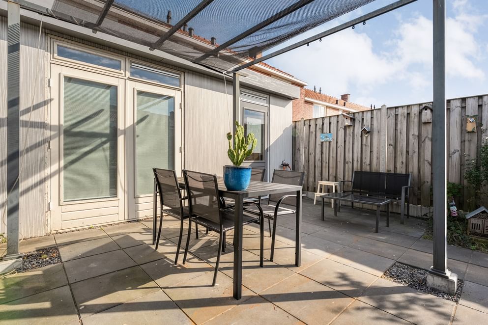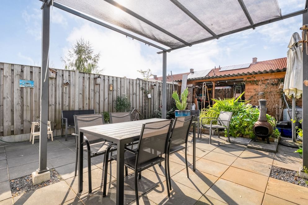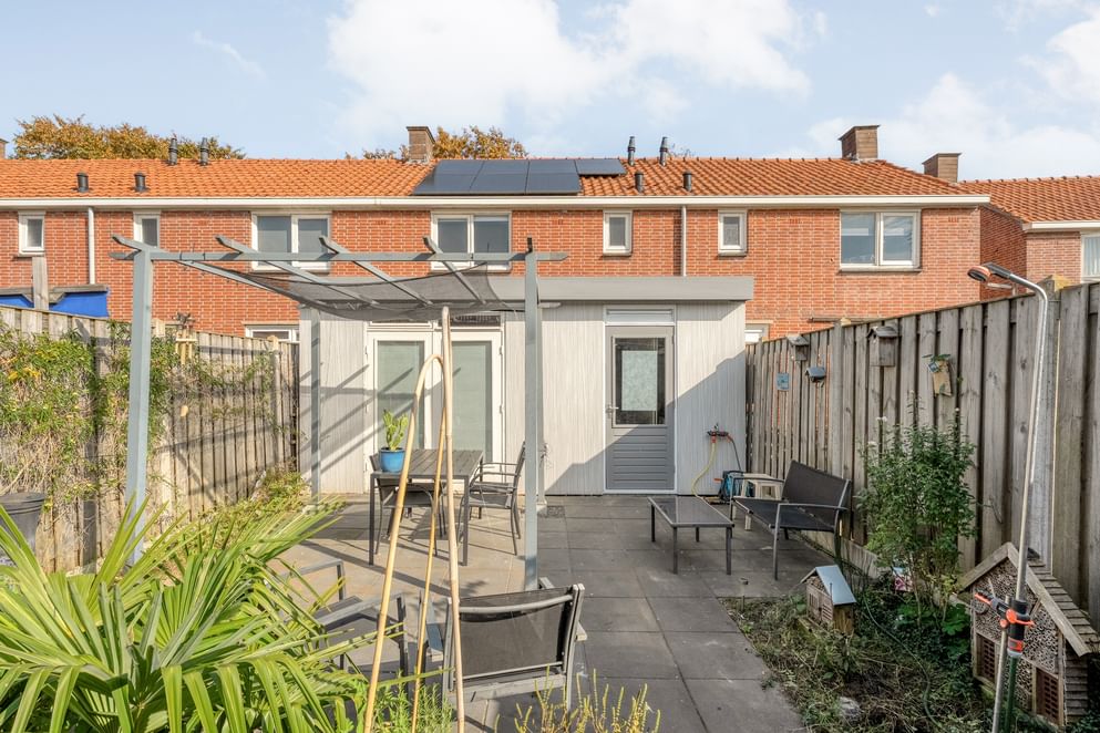 De tuin ligt op het westen en is onderhoudsvriendelijk ingericht. Dankzij de openslaande deuren in de uitbouw loopt binnen moeiteloos over in buiten. Achter in de tuin bevindt zich een handige berging met afdak, ideaal voor fietsen of tuingereedschap.