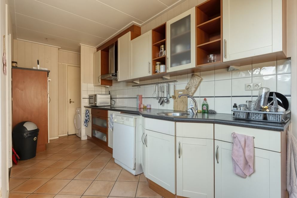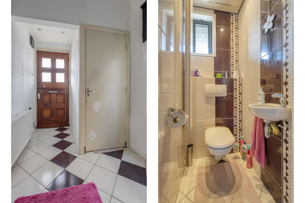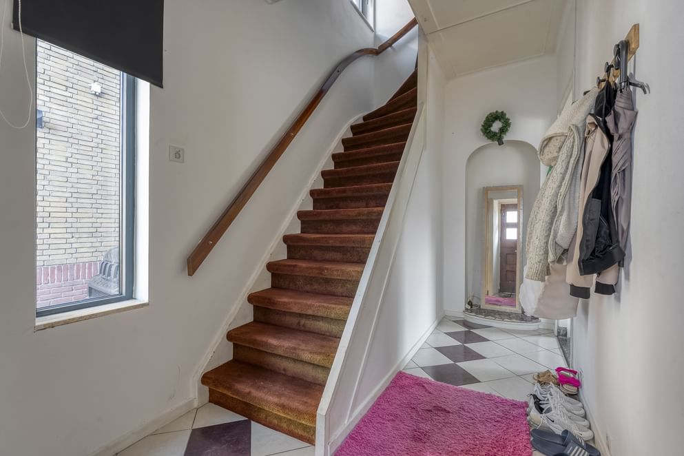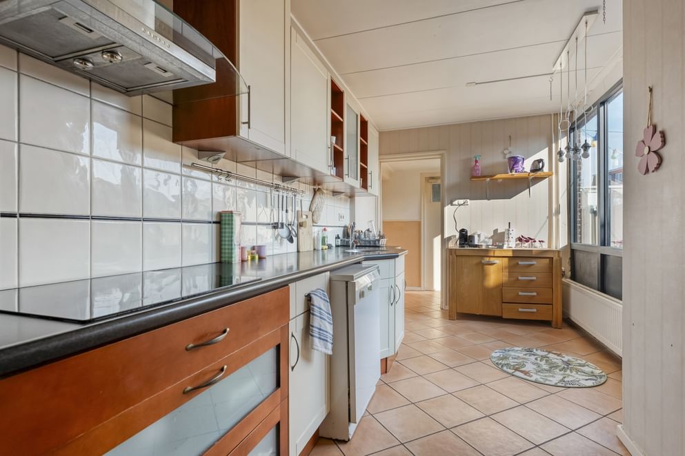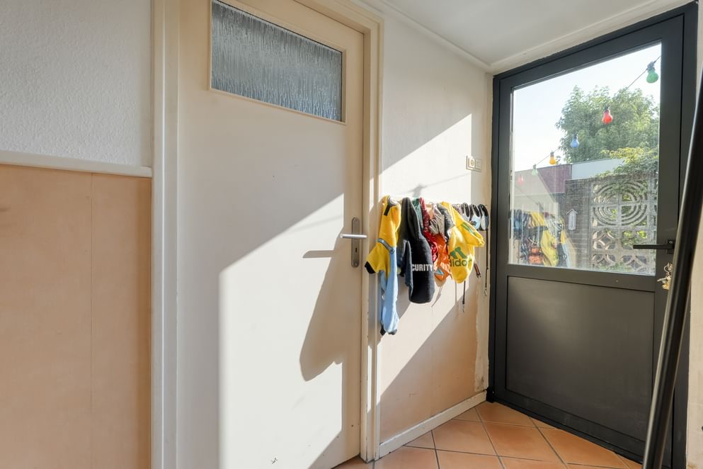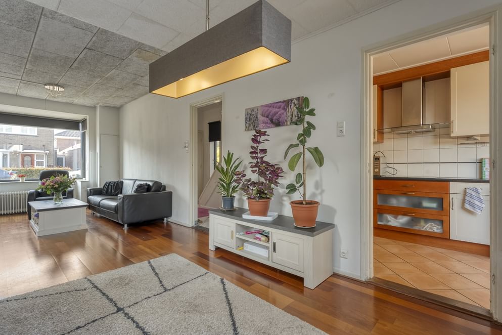 Bij binnenkomst tref je een ruime hal met toegang tot het toilet en de royale woonkamer. Dankzij de erker geniet de woonkamer van veel lichtinval en een open uitstraling. Er is voldoende plek voor een grote eettafel en de schuifpui zorgt ervoor dat de tuin op zomerse dagen een verlengstuk wordt van de leefruimte. De keuken is praktisch ingericht met volop opbergruimte en voorzien van een vaatwasser, inductiekookplaat en witgoedaansluiting. Onder de trap bevindt zich een handige bergkast, en achterin de woning is er een bijkeuken met extra witgoedaansluiting.