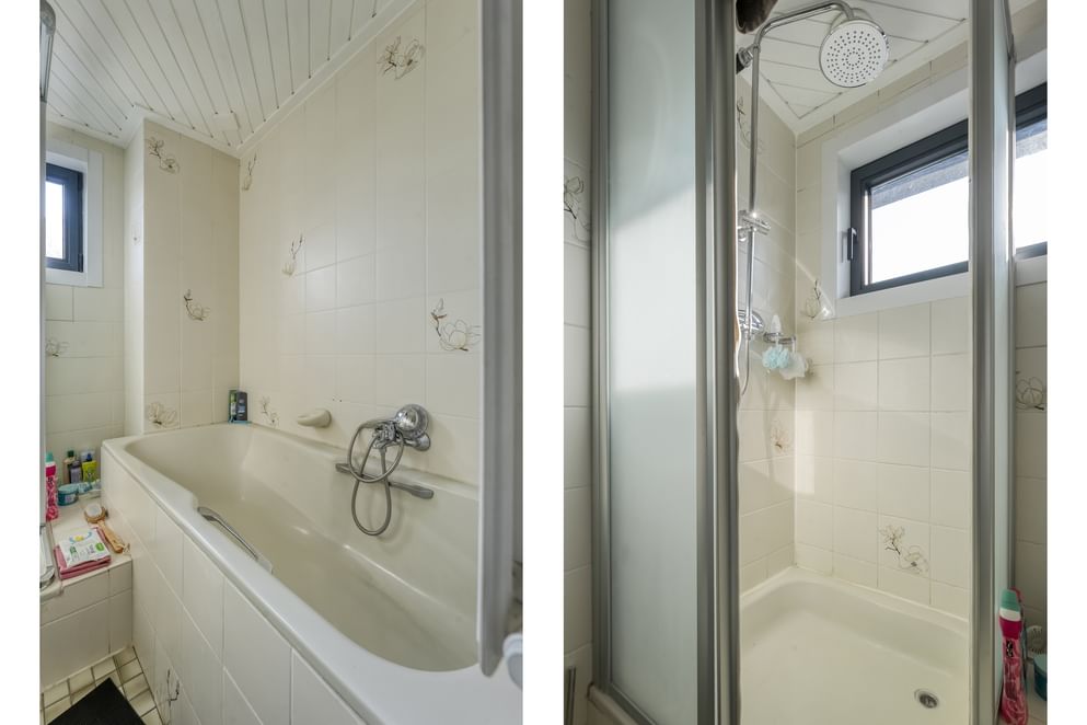 De eerste verdieping beschikt eveneens over twee kamers en een tweede badkamer met douche, wastafel en toilet.