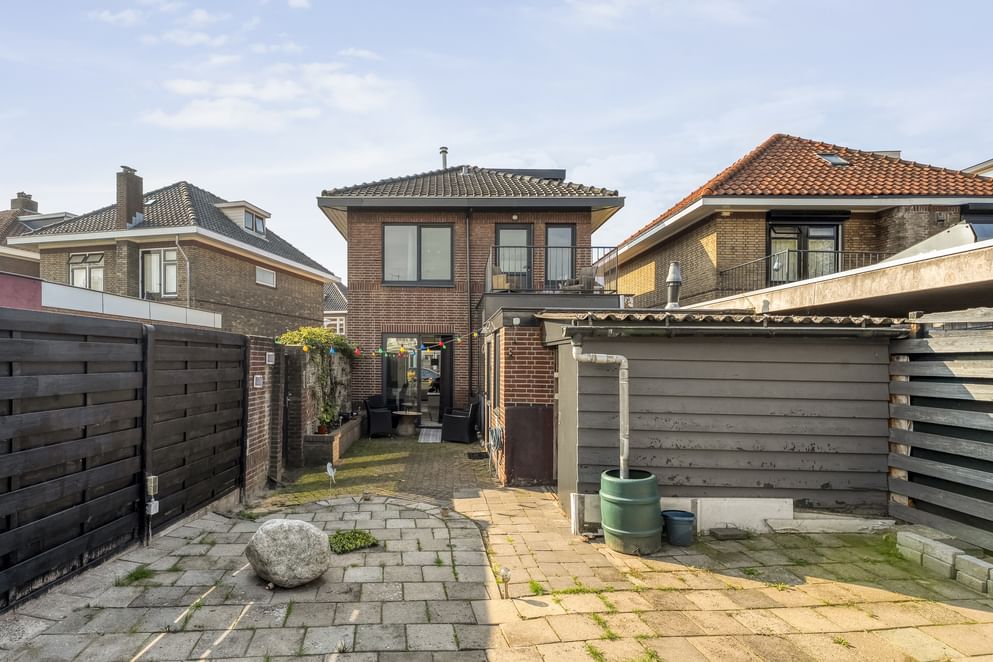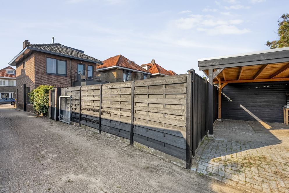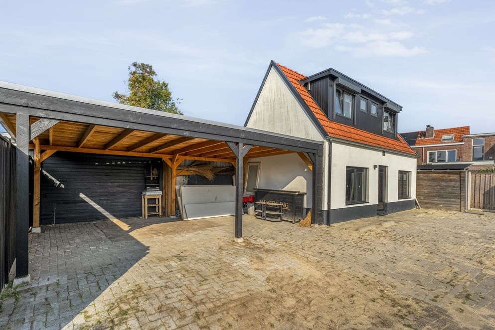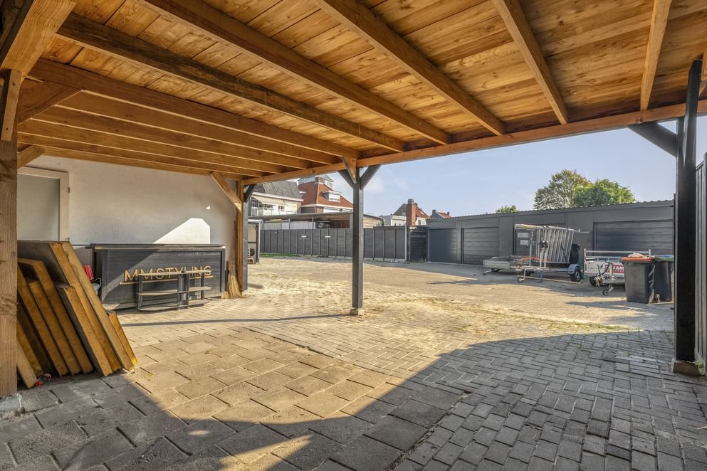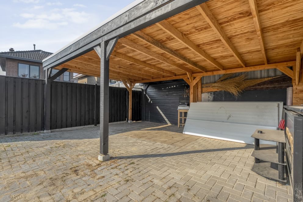 De tuin vormt een belangrijk pluspunt: een ruim perceel met achterom, veel bergruimte en een overkapping achterin waar je meerdere auto’s kunt parkeren op eigen terrein.