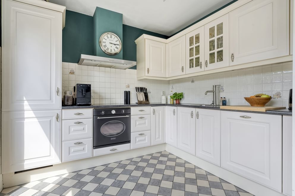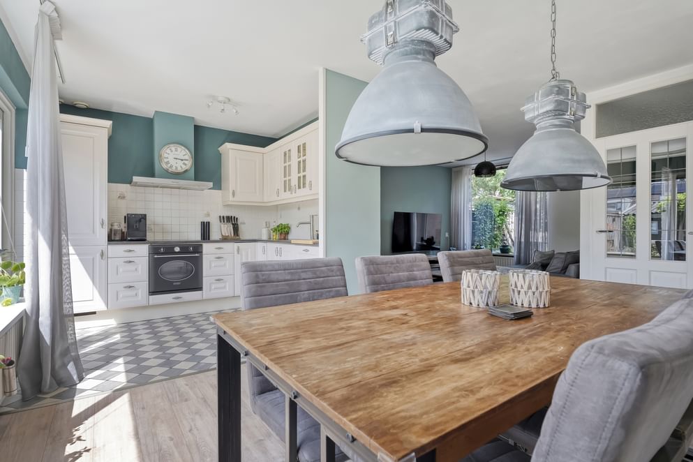 Bij binnenkomst valt meteen de warme uitstraling van deze woning op. De woonkamer is ruim en licht, dankzij de grote raampartijen, en staat in open verbinding met de eetruimte en de landelijke keuken. De keuken is voorzien van moderne inbouwapparatuur zoals een koelkast, fornuis en oven. De begane grond straalt sfeer en comfort uit, een plek waar je graag samenkomt.