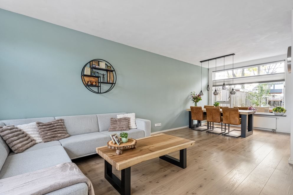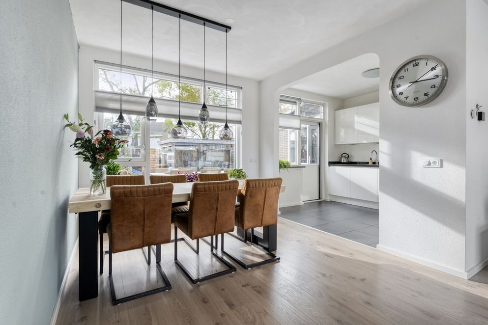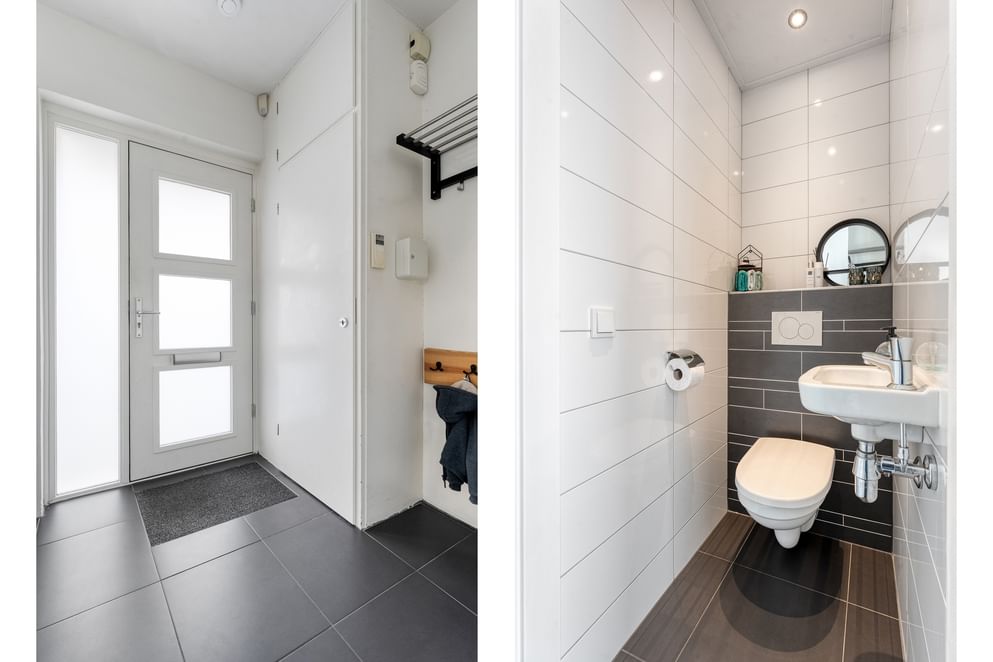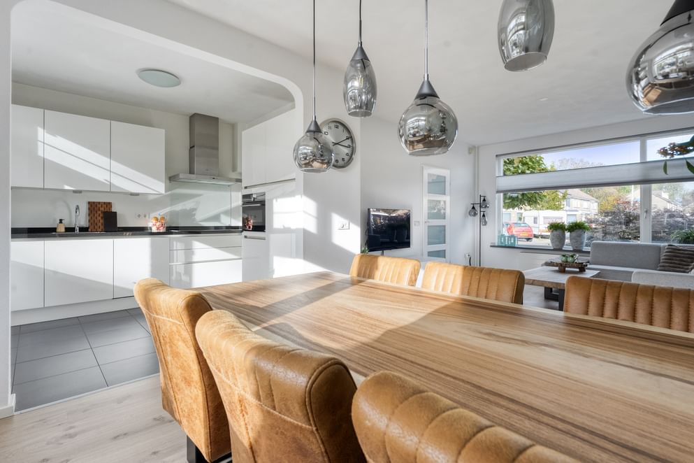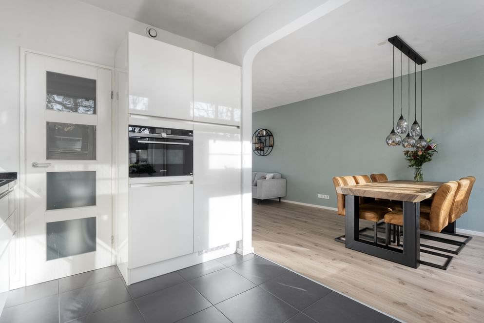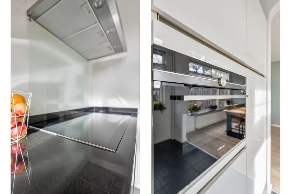 Bij binnenkomst kom je in de ruime hal met de trapopgang en het toilet. Vanuit hier bereik je de lichte woonkamer, waar de grote ramen zorgen voor een prettige sfeer en veel daglicht. Er is volop ruimte voor een gezellige zithoek én een eettafel. De woonkamer sluit mooi aan op de moderne keuken, die van alle gemakken is voorzien: een inductiekookplaat, stoom oven combinatie van Siemens, vaatwasser, vloerverwarming en veel opbergruimte. Een perfecte plek om te koken en te genieten met familie of vrienden.