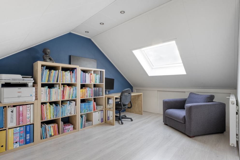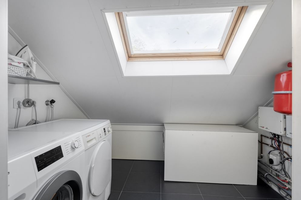 De tweede verdieping is volledig afgewerkt en beschikt over een dakraam dat zorgt voor extra licht. Deze ruimte is uitermate geschikt als vierde slaapkamer, werkkamer of hobbyruimte. Hier vind je tevens de witgoedaansluitingen in een aparte wasruimte, tevens voorzien van een dakraam voor extra licht.