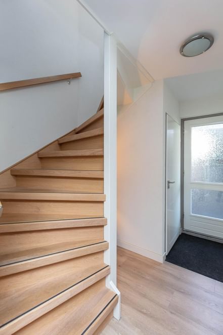 Via de overdekte entree kom je binnen in de hal. Deze geeft je toegang tot de moderne toilet met fonteintje, trapopgang en royale leefruimte. Aan de voorzijde van de woning kun je de woonkamer vinden. De woonkamer is zeer ruim en leent zich voor verschillende indelingen. Wanneer je doorloopt naar de achterzijde van de woning, kom je uit in de ruime leefkeuken. De moderne keuken is voorzien van diverse inbouwapparatuur zoals een combi-magnetron, combi-stoomoven, inductie kookplaat en een kokend water kraan van het merk Franke. De bijkeuken is voorzien van een keukenblok, boiler en aansluiting voor een wasmachine of vaatwasser en geeft voldoende extra bergruimte. De woonkamer, keuken en hal zijn voorzien van vloerverwarming.