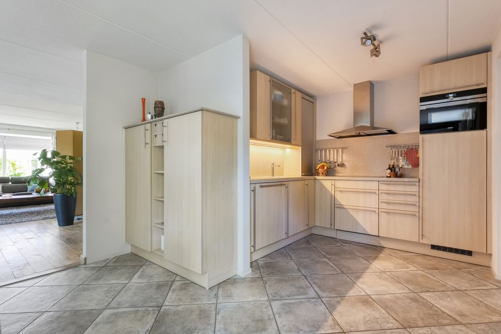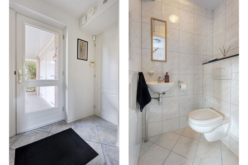 Bij binnenkomst kom je in de ruime hal waar het toilet, de trapopgang en de toegang tot de woonkamer zich bevinden. De woonkamer is royaal opgezet, voorzien van een sfeervolle erker die zorgt voor veel daglicht en een prettige indeling. Via de eetruimte loop je door naar de keuken, die compleet is uitgevoerd met een keramisch 4-pits fornuis, spoelbak, natuurstenen blad, vaatwasser, combimagnetron en koelkast. De openslaande deuren maken de tuin een natuurlijk verlengstuk van de leefruimte. De bijkeuken is praktisch ingericht met een witgoedaansluiting en geeft toegang tot zowel de garage als de tuin.