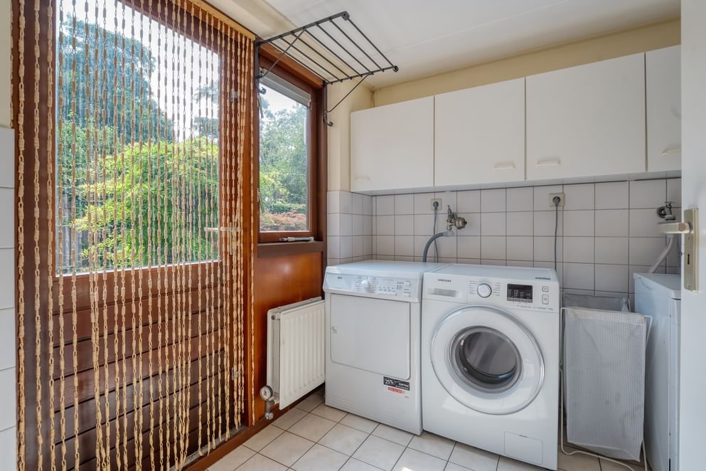 Bij binnenkomst valt meteen de ruimte en de lichte uitstraling op. De woonkamer is royaal en heeft een prettige verbinding met de keuken, waar tevens de eettafel staat. De keuken is functioneel ingericht en voorzien van een oven, vriezer en een 4-pits gasfornuis. Achter een aparte deur bevindt zich de bijkeuken en wasruimte, waar u eenvoudig extra apparatuur kunt plaatsen, zoals een tweede koelkast of vriezer. Vanuit de keuken is bovendien de toegang tot de garage, wat extra praktisch is in het dagelijks gebruik.