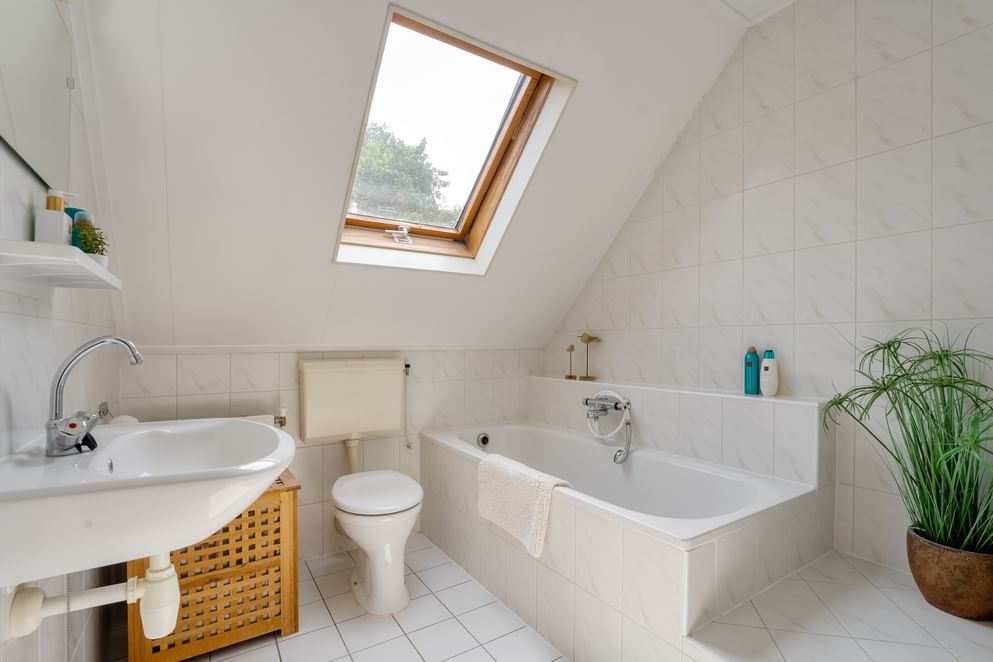 Op de eerste verdieping bevinden zich vier ruime slaapkamers, stuk voor stuk voorzien van extra bergruimte achter de knieschotten. De badkamer is royaal opgezet en uitgerust met een ligbad, een aparte douche, een wastafel en een toilet. Een fijne en complete ruimte waar u in alle comfort de dag kunt beginnen en eindigen.