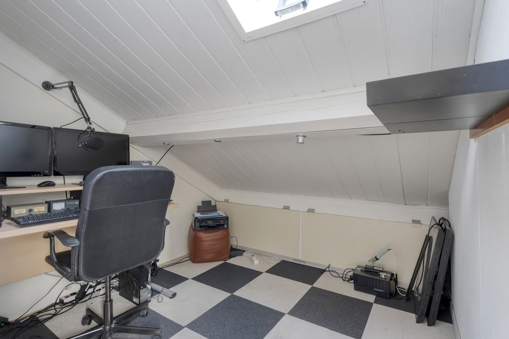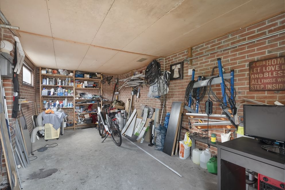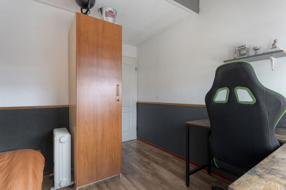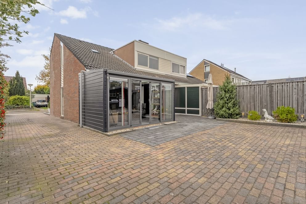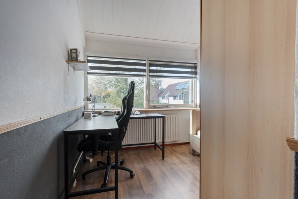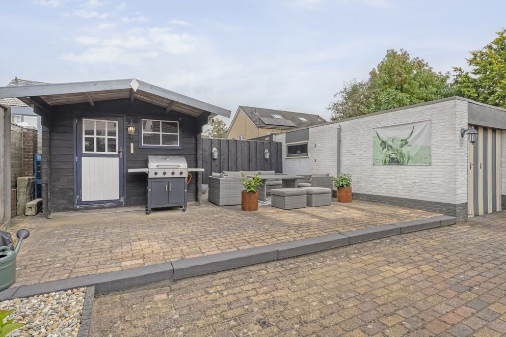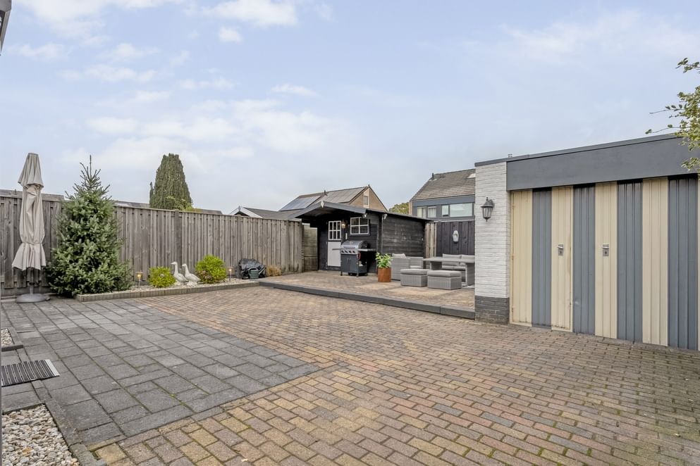 De zonnige en diepe achtertuin is onderhoudsvriendelijk aangelegd en biedt volop ruimte om buiten te zitten. Dankzij de schuifpui loopt de woonkamer mooi over in het terras, wat zorgt voor een fijne verbinding tussen binnen en buiten. Achter in de tuin staat een vrijstaande houten berging en via de oprit is tevens de garage bereikbaar, groot genoeg om een auto in te plaatsen. Daarnaast is er ruime parkeergelegenheid op eigen terrein.