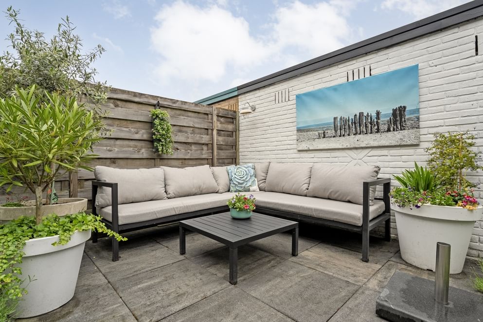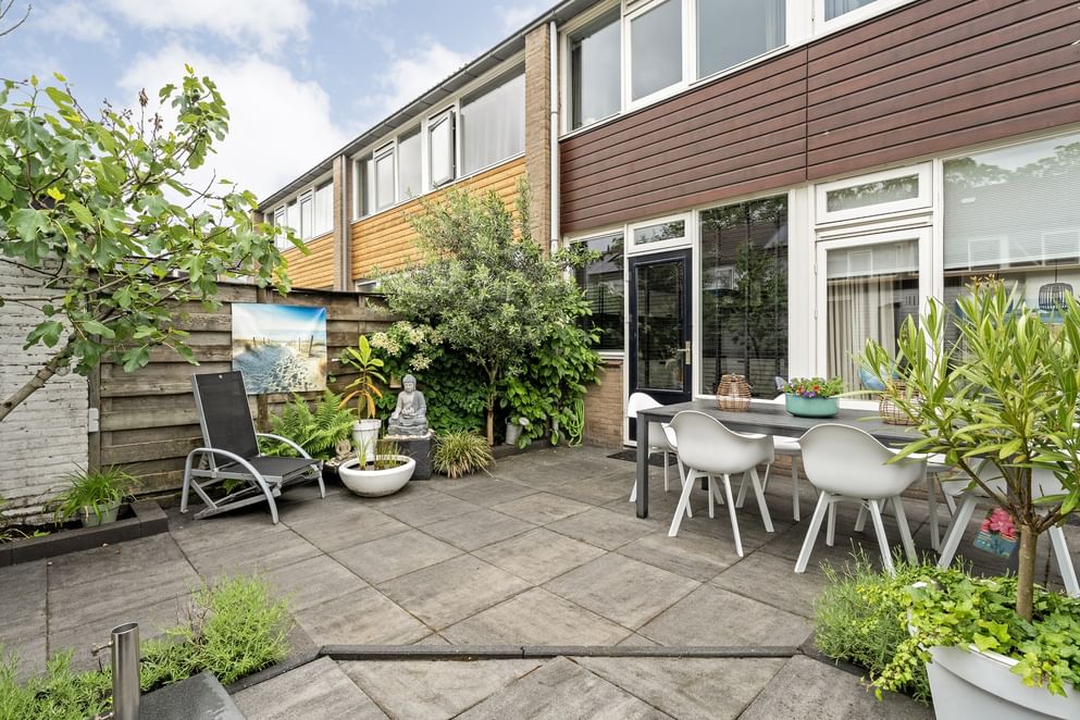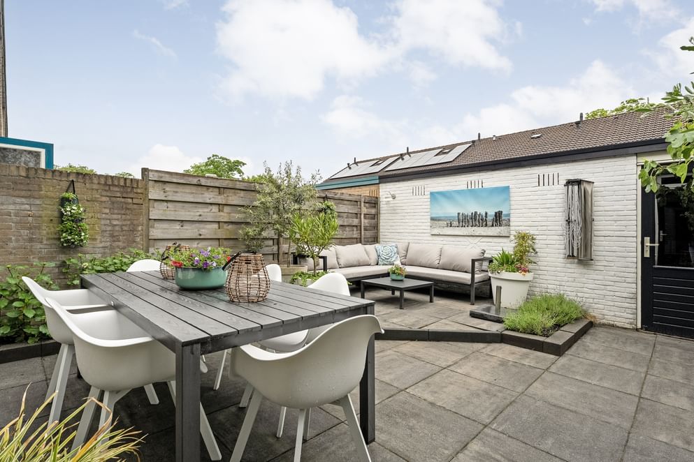 De achtertuin is sfeervol ingericht en biedt volop ruimte om te zitten, relaxen of gezellig buiten te eten. Door de noordelijke ligging blijft het hier in de zomer lekker koel. Via de achterom bereik je eenvoudig de berging, ideaal voor fietsen of tuingereedschap.