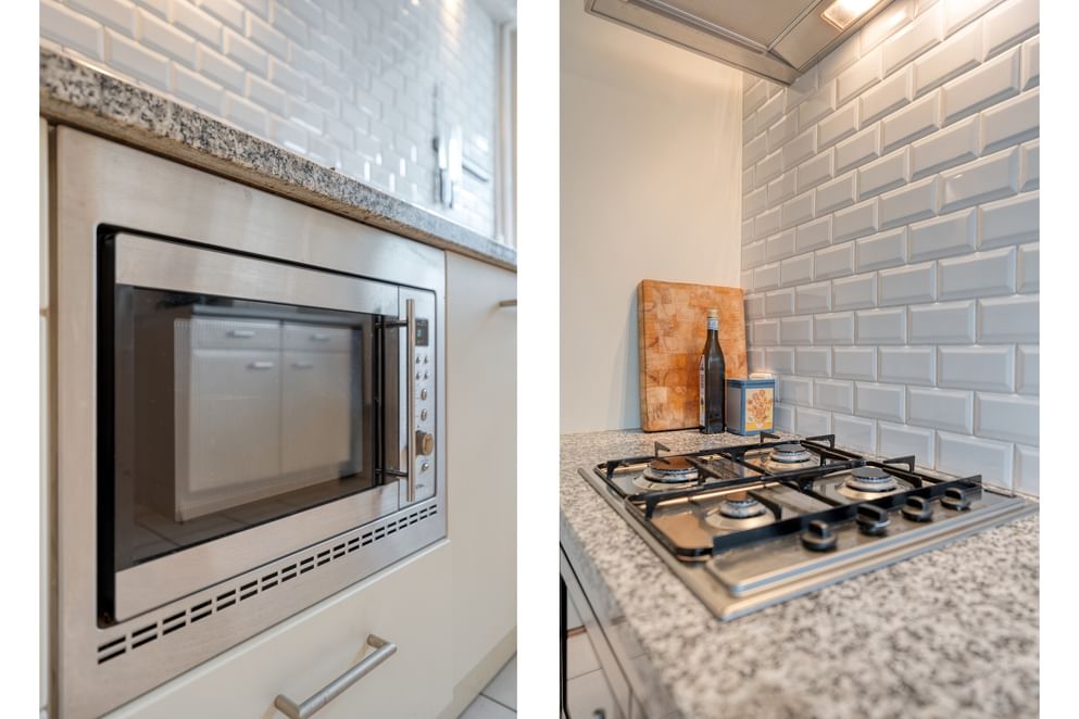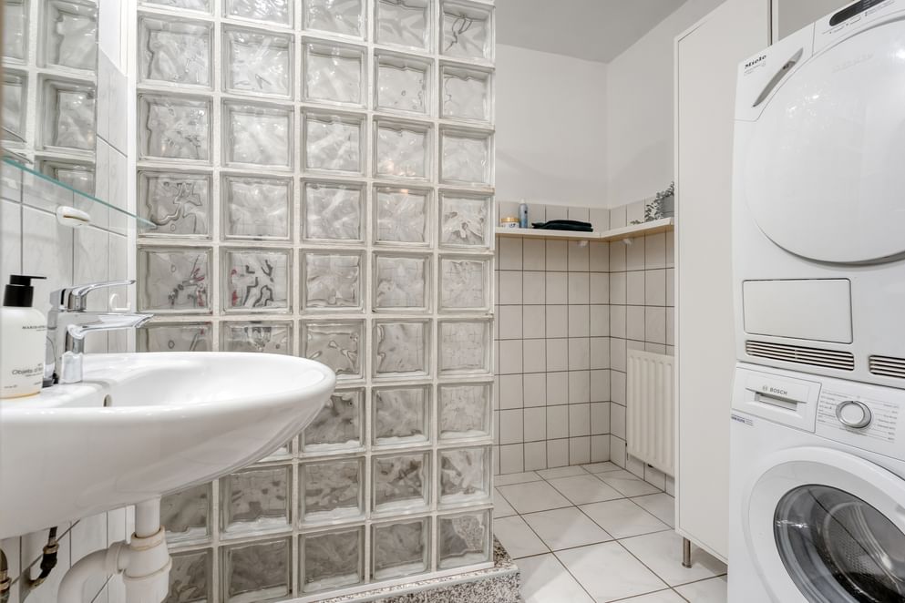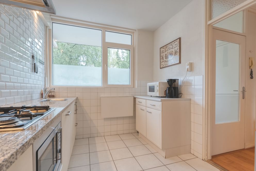 De keuken is modern uitgevoerd en voorzien van diverse inbouwapparatuur, waaronder een combi-oven, vaatwasser, 4-pits gasfornuis, spoelbak en koelkast. Vanuit de hal zijn ook de twee slaapkamers bereikbaar, beide royaal van formaat en voorzien van grote ramen voor extra daglicht. Eén slaapkamer beschikt bovendien over een vaste kast. De badkamer is compleet met een inloopdouche, wastafel en witgoedaansluiting.