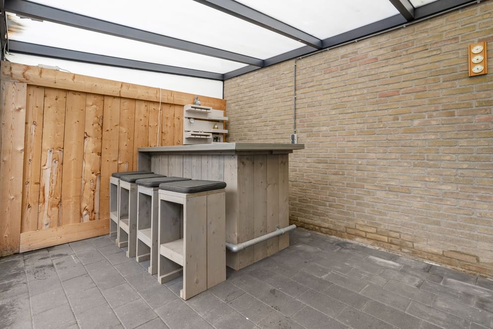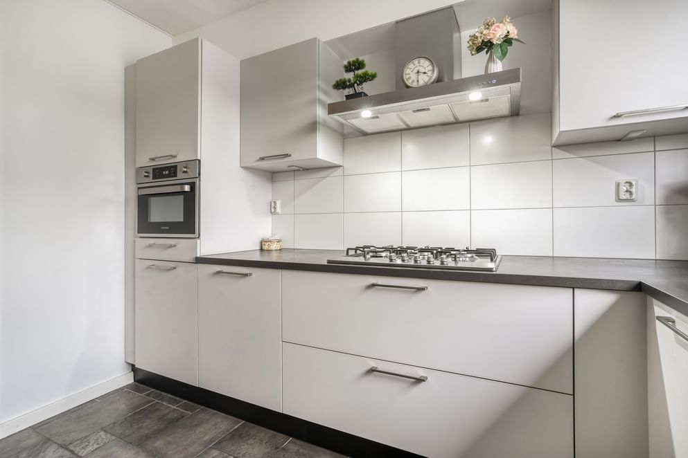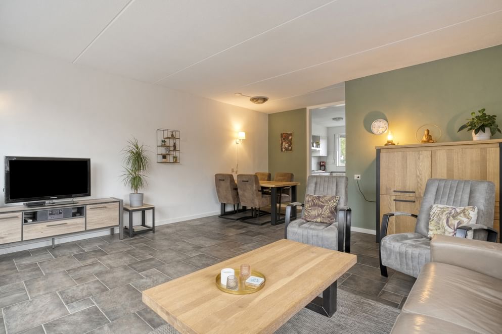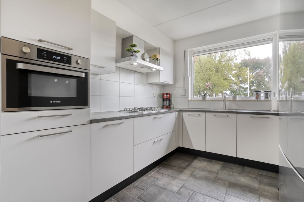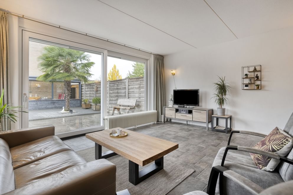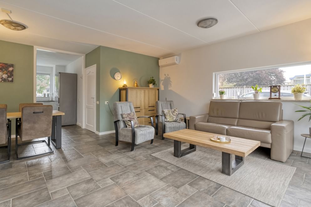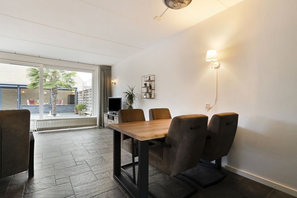 Bij binnenkomst valt direct de lichte en ruime woonkamer op. De grote schuifpui zorgt voor veel daglicht en verbindt binnen en buiten op een natuurlijke manier. De woonkamer is voorzien van een comfortabele airco, waardoor het hier zowel in de zomer als winter aangenaam vertoeven is. De ruimte biedt voldoende plek voor een grote eettafel en loopt door naar de moderne keuken, die in 2021 is vernieuwd. Deze keuken is compleet uitgerust met een vaatwasser, combi-oven, veel bergruimte en een strak werkblad.