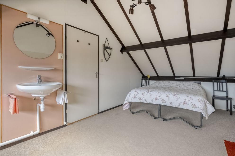Via een tweede hardhouten trap bereik je de zolderverdieping. Hier bevindt zich een vijfde slaapkamer, voorzien van een vaste wastafel. Dankzij de dakkapel is deze zolderkamer verrassend ruim en geschikt voor meerdere doeleinden (slaap-/logeerkamer, werkruimte, hobbykamer).