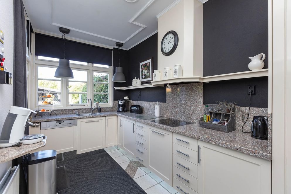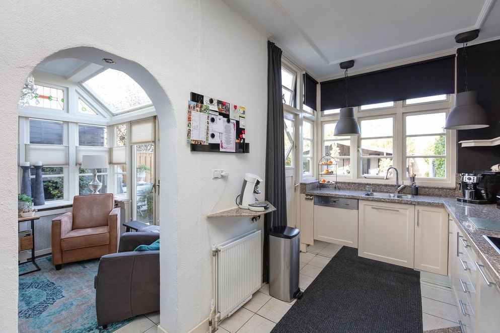 Wanneer je doorloopt naar achter, kom je in de keuken terecht. Deze is voorzien van een natuurstenen blad, koelkast, vriezer, vaatwasser en inductiekookplaat.