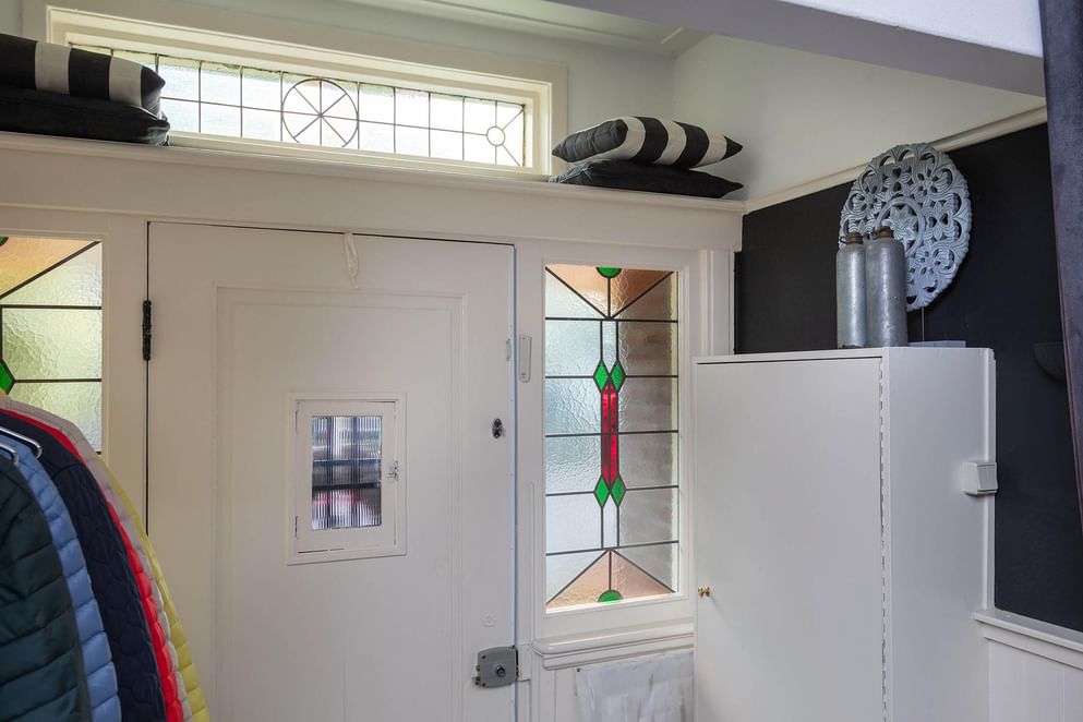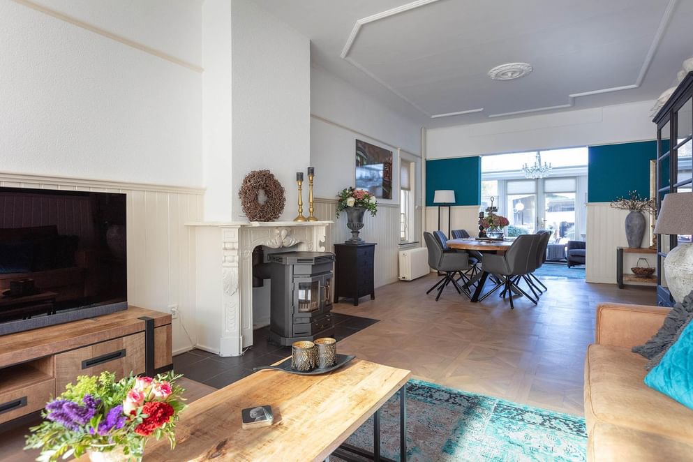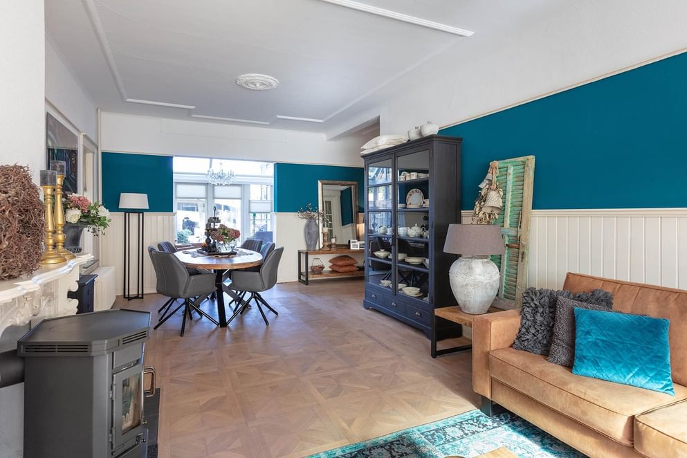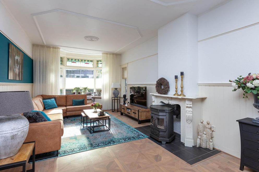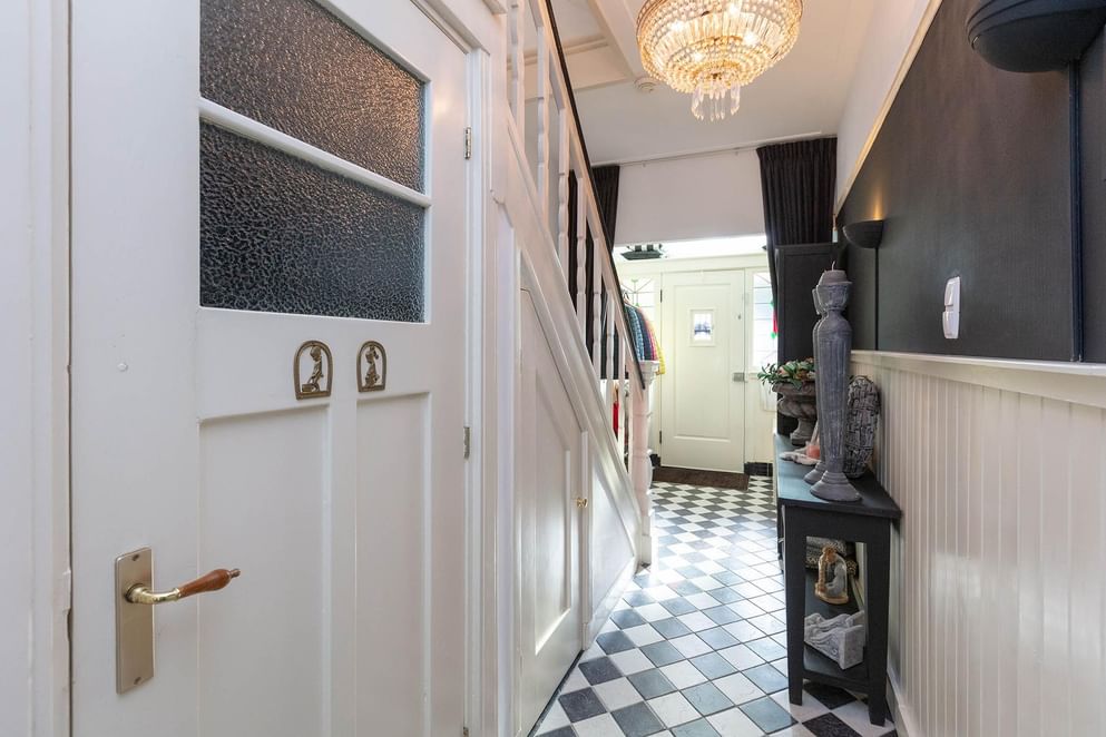 Via de met luifel overdekte entree, kom je de woning binnen in de hal. De authentieke hal bevat de trapopgang, moderne toilet en toegang tot de kelder. Vanuit de hal kom je in de woonkamer. Deze is aan de voorkant van de woning gesitueerd en beschikt onder andere over een karakteristieke erker, een originele houden vloer en hout gestookte kachel.