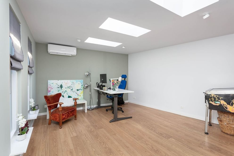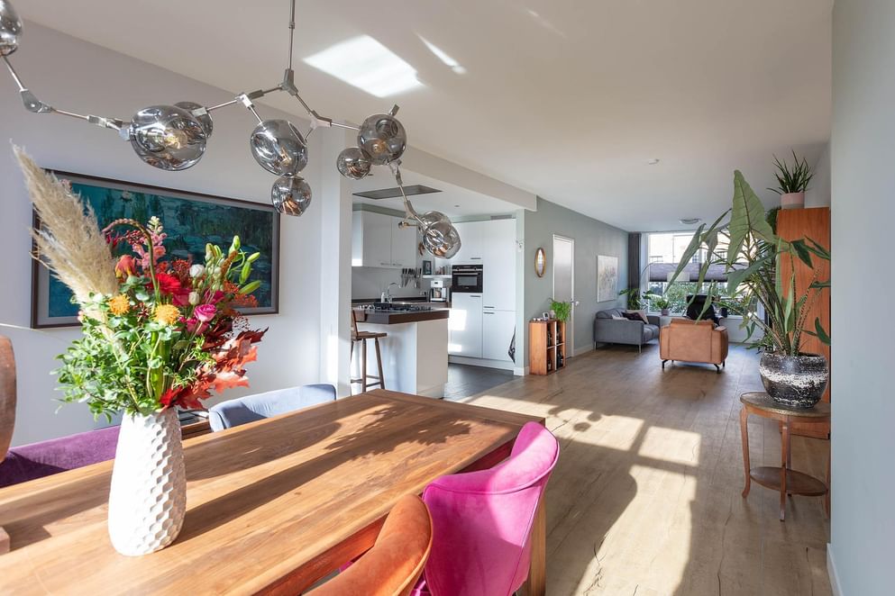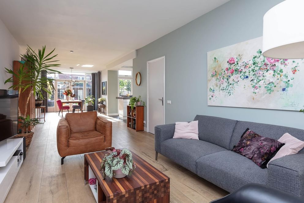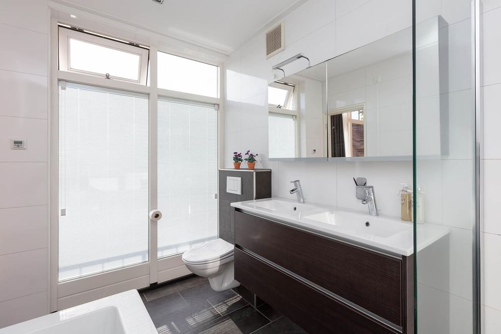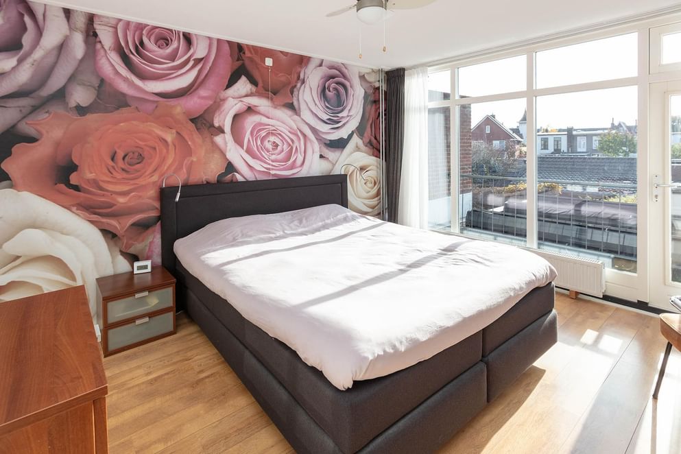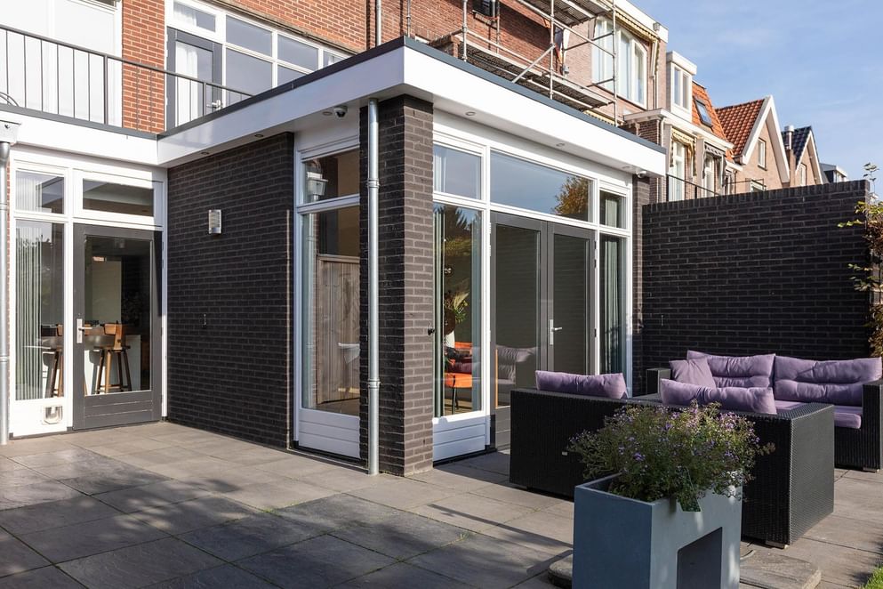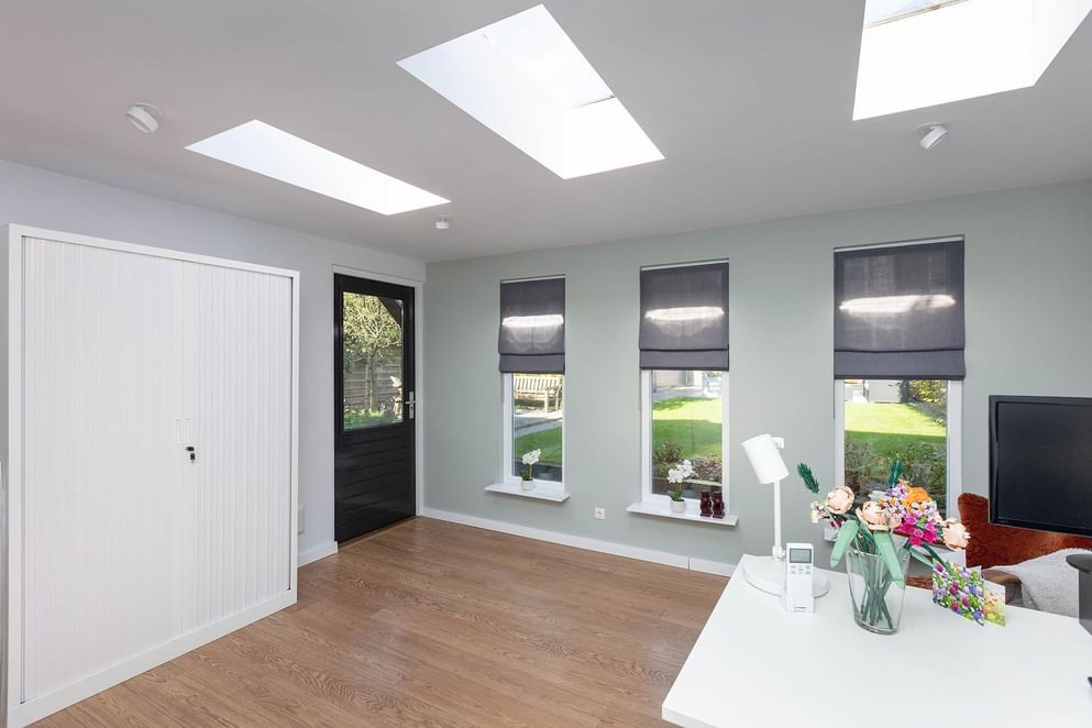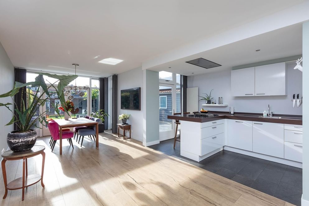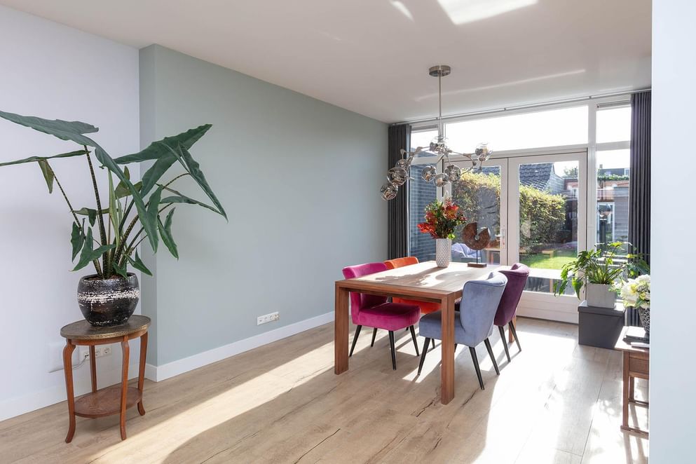 Aan de achterzijde is de woning uitgebouwd. Hierdoor is er een ruime eetkamer ontstaan met toegang tot de achtertuin. Er zijn namelijk twee openslaande deuren, waardoor je het binnen-buiten gevoel kunt creëren.
