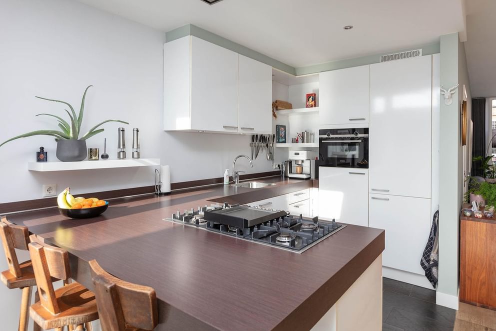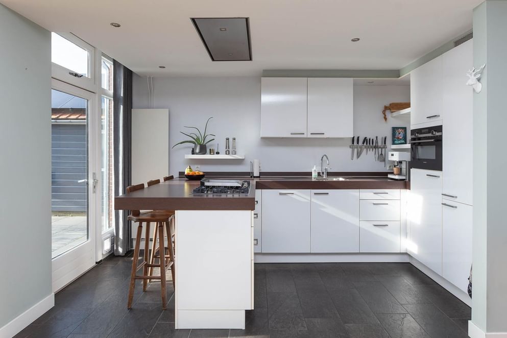 De moderne, U-vormige keuken is werkelijk van alle gemakken voorzien. Het beschikt namelijk over diverse inbouwapparatuur, zoals een vaatwasser, combimagnetron, vier pits kookplaat met bakplaat en een in het plafond geïntegreerde afzuigkap. Ook is er voldoende werkruimte en er is een gezellige bar waar je aan kunt zitten. Tevens is er in de keuken nog een deur richting de achtertuin te vinden.