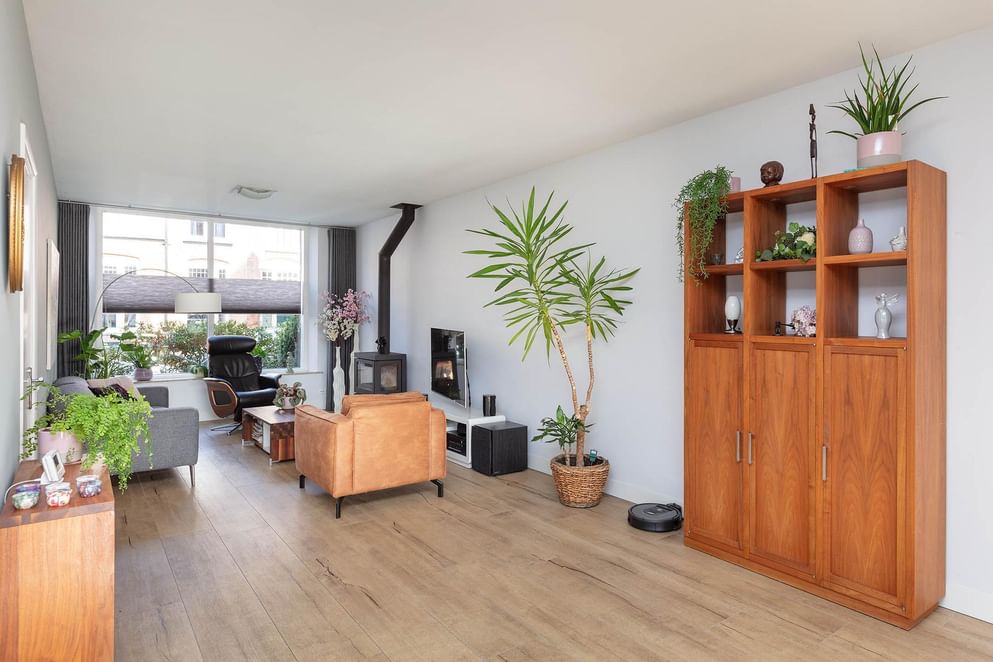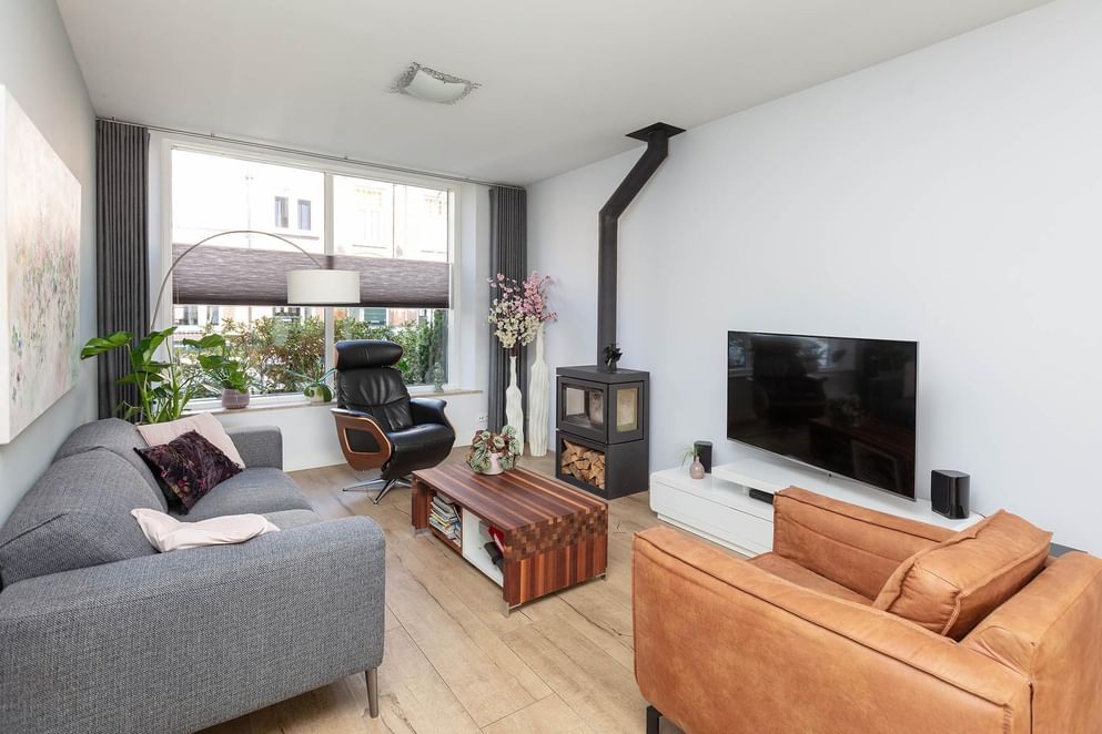 De hal geeft je toegang tot het moderne toilet met fonteintje, kelderkast, trapopgang en leefruimte. De woonkamer is aan de voorzijde van de woning gesitueerd en is met recht zeer ruim te noemen. De grote raampartij zorgt ervoor dat de woonkamer veel lichtinval geniet en de houtkachel maakt het geheel sfeervol. Daarnaast beschikt de woonkamer over een keramisch parket in combinatie met vloerverwarming.