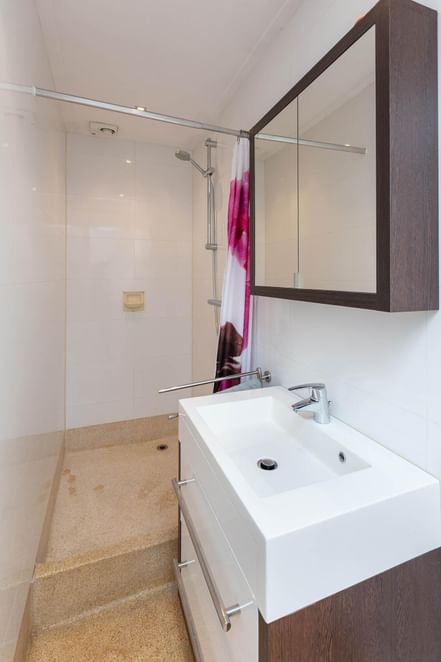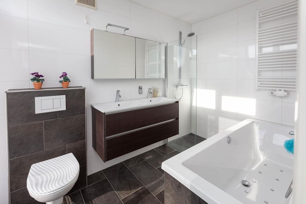 Via de overloop heb je toegang tot drie slaapkamers en twee badkamers. Een van de slaapkamers heeft toegang tot een balkon dat uitkijkt over de achtertuin. De eerste badkamer is voorzien van een dubbele wastafel met meubel, spiegelkast, toilet, ligbad/bubbelbad, inloopdouche en elektrische vloerverwarming. De tweede badkamer heeft een wastafel met meubel, spiegelkast en douche.