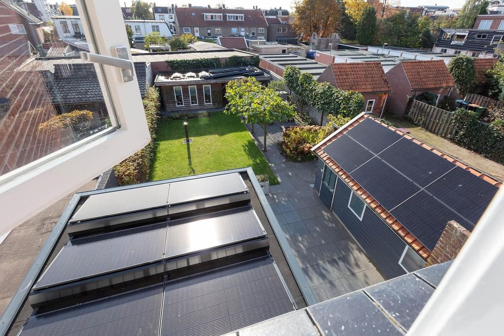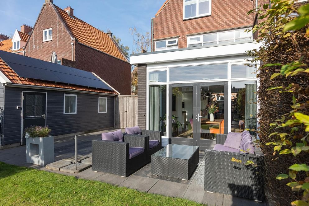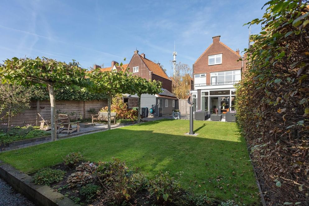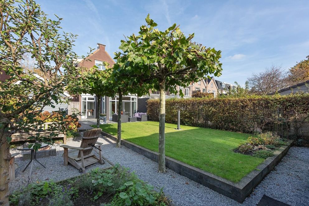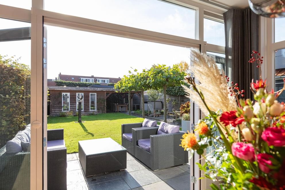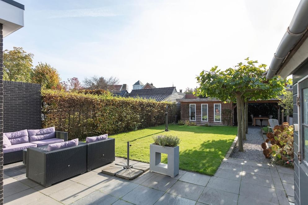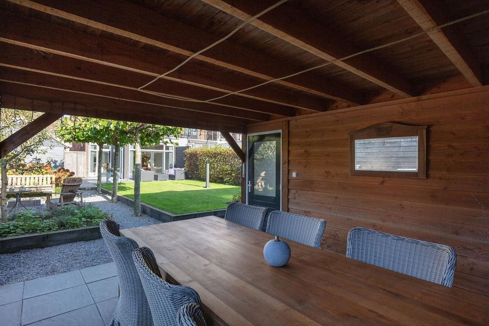 De fraai aangelegde achtertuin is zowel te bereiken vanuit de eetkamer, keuken als via een achterom. De tuin is voorzien van meerdere terrassen, een ruime garage en een overkapping met fijne, geïsoleerde thuiswerkplek voorzien van airco die tevens kan verwarmen.