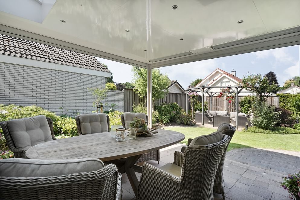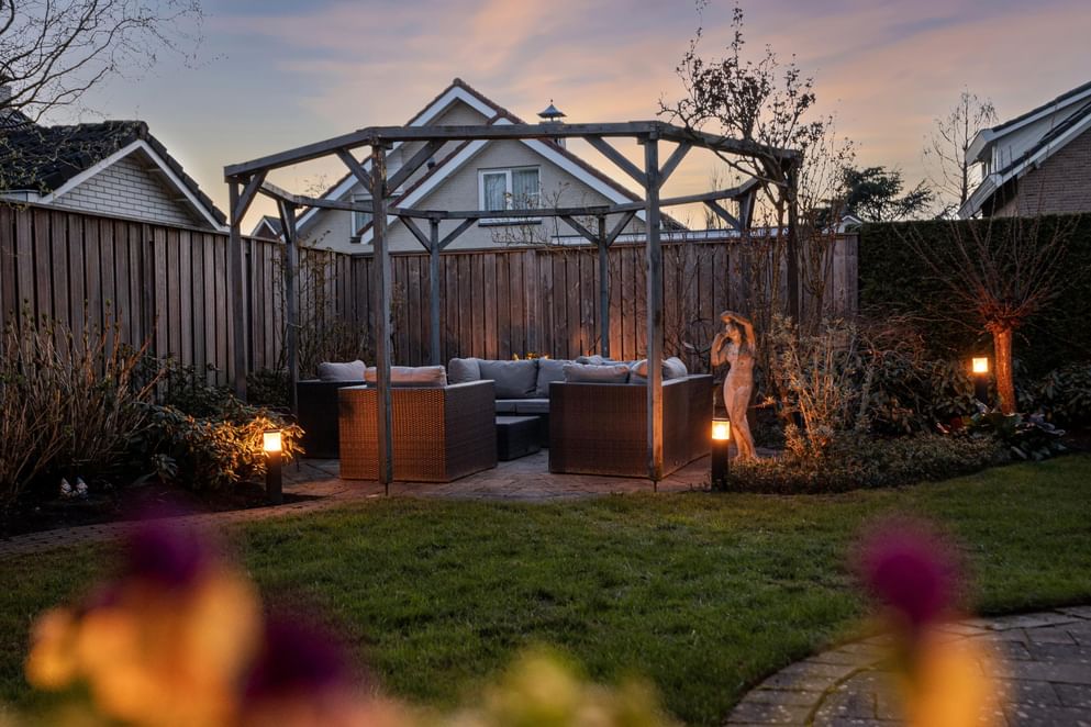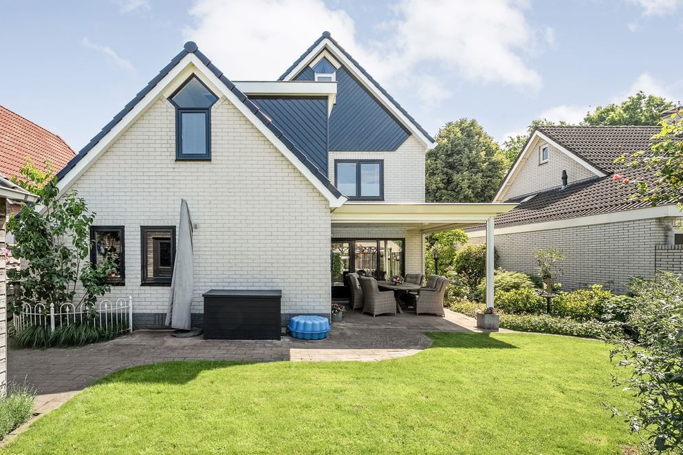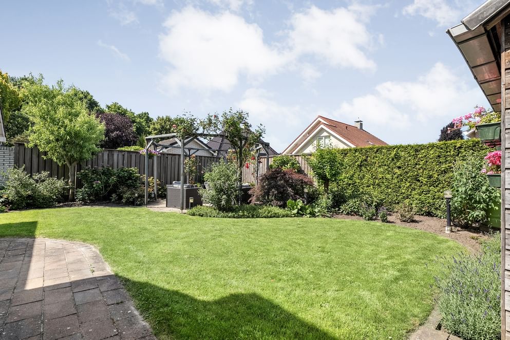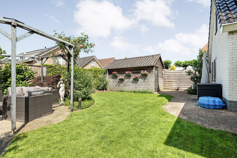 De achtertuin is ruim en beschikt over een overkapping aan de woning, waardoor het makkelijk is om buiten een kop koffie te drinken. Daarnaast is er een tuinhuis, handig voor het opbergen van tuingereedschap en andere spullen. Een praktische en prettige buitenruimte om van te genieten.