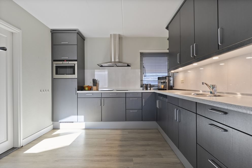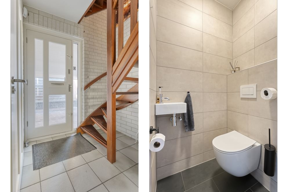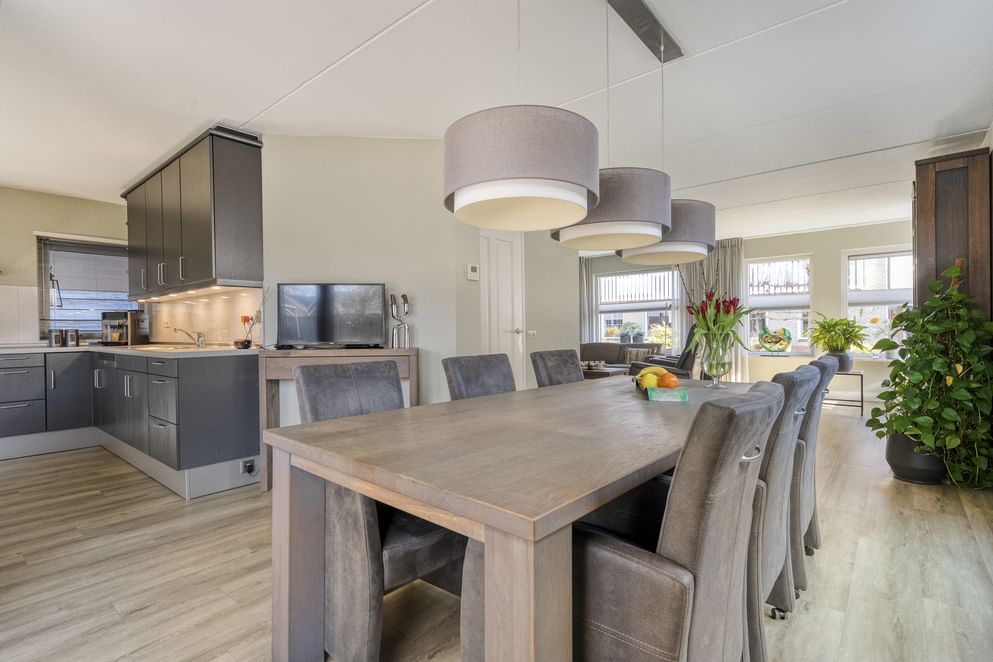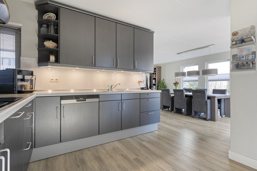 Bij deze woning stapt u binnen in de entree, voorzien van een toilet, de meterkast en de trapopgang naar de eerste verdieping. Vanuit de hal bereikt u de fijne woonkamer. De woonkamer staat in directe verbinding met de ruime open keuken, waardoor er een prettige doorloop en veel licht ontstaat. Via de keuken is er bovendien toegang tot de bijkeuken en de garage, waardoor alles praktisch en binnen handbereik is. Zowel de woonkamer als de keuken zijn uitgerust met vloerverwarming, wat bijdraagt aan een comfortabele woonervaring.