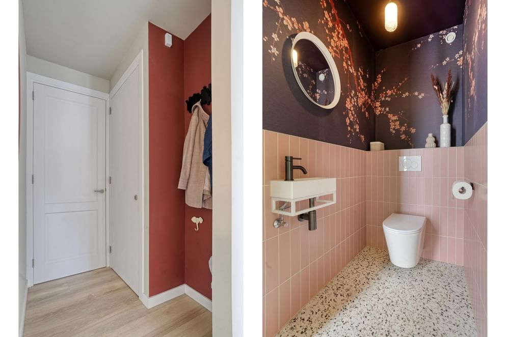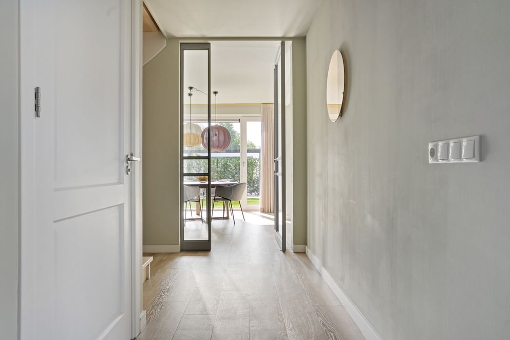 Je betreedt de woning via de entree, die is uitgerust met een toilet met fontein, de meterkast en de trap naar de eerste verdieping. Vanuit de entree heb je toegang tot zowel de bijkeuken als de eetkamer. De eetkamer loopt naadloos over in de ruime, lichte woonkamer aan de voorzijde van de woning, waardoor er een open en prettige leefruimte ontstaat.
