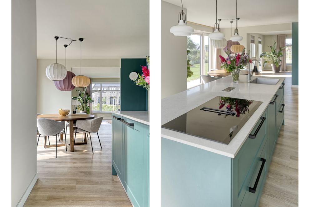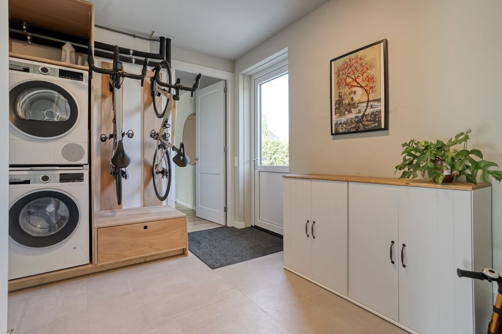 De moderne open keuken is voorzien van hoogwaardige inbouwapparatuur, waaronder een inductiekookplaat, koel-/vriescombinatie, spoelbak, Quooker, oven en stoomoven. Vanuit de keuken is de praktische kantoorruimte bereikbaar, ideaal voor thuiswerken. Daarnaast is er toegang tot de bijkeuken, die beschikt over een witgoedaansluiting en een deur naar de tuin.