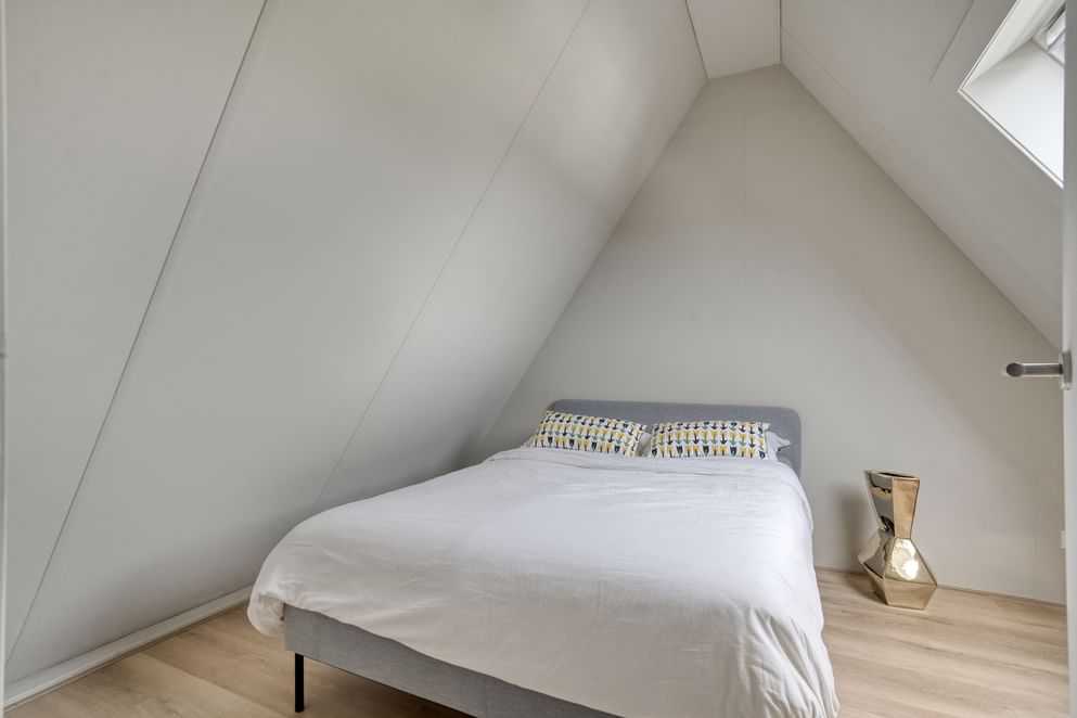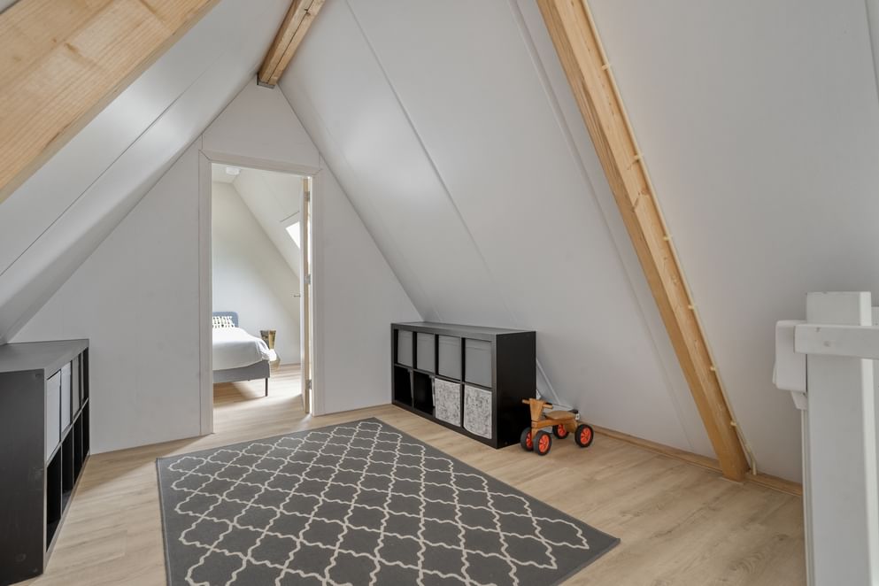 De tweede verdieping, die eenvoudig te bereiken is via een vaste trap, biedt niet alleen een extra slaapkamer maar ook ruime mogelijkheden voor het opbergen van spullen. Dankzij de praktische indeling is er voldoende ruimte, waardoor deze verdieping ideaal geschikt is voor bijvoorbeeld een werk- of logeerkamer, hobbyruimte of extra opslag.