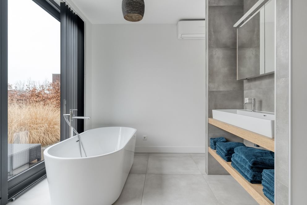 De woning beschikt over drie slaapkamers. De royale masterbedroom heeft directe toegang tot een luxe badkamer en een ruime inloopkast. Deze badkamer is uitgerust met een vrijstaand ligbad, een ruime inloopdouche en een stijlvolle wastafelopstelling. Dankzij de grote ramen valt hier veel natuurlijk licht binnen en kijk je direct uit op de tuin.