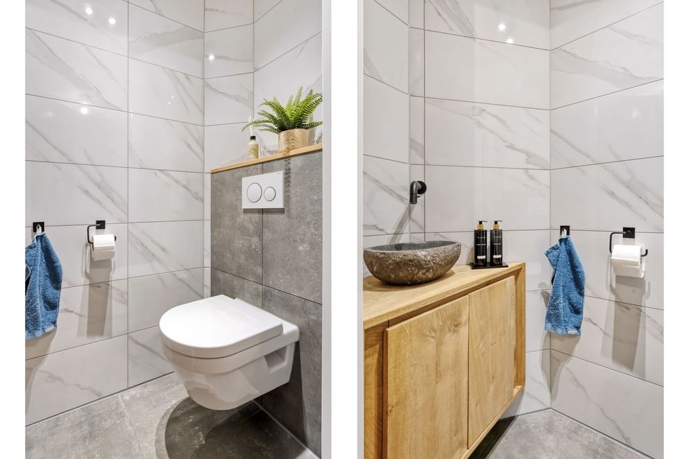 De eerste verdieping beschikt over ruime slaapkamers, waarbij alle kamers zijn voorzien van rolluiken. De masterbedroom biedt daarnaast toegang tot een balkon. De badkamer is modern en compleet uitgevoerd met een zwevend toilet, dubbele wastafel en een inloopdouche.