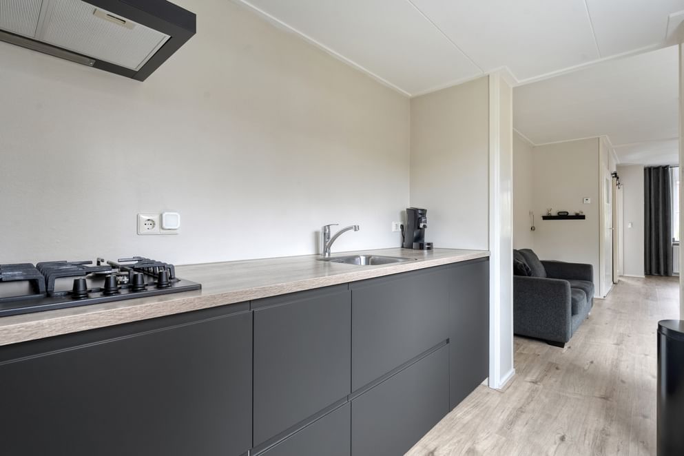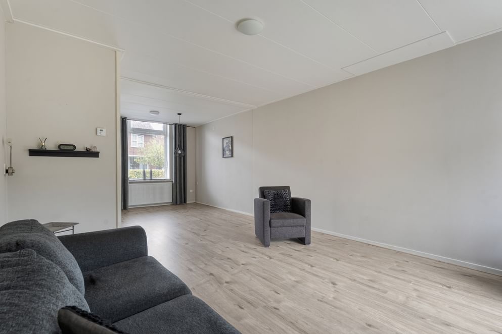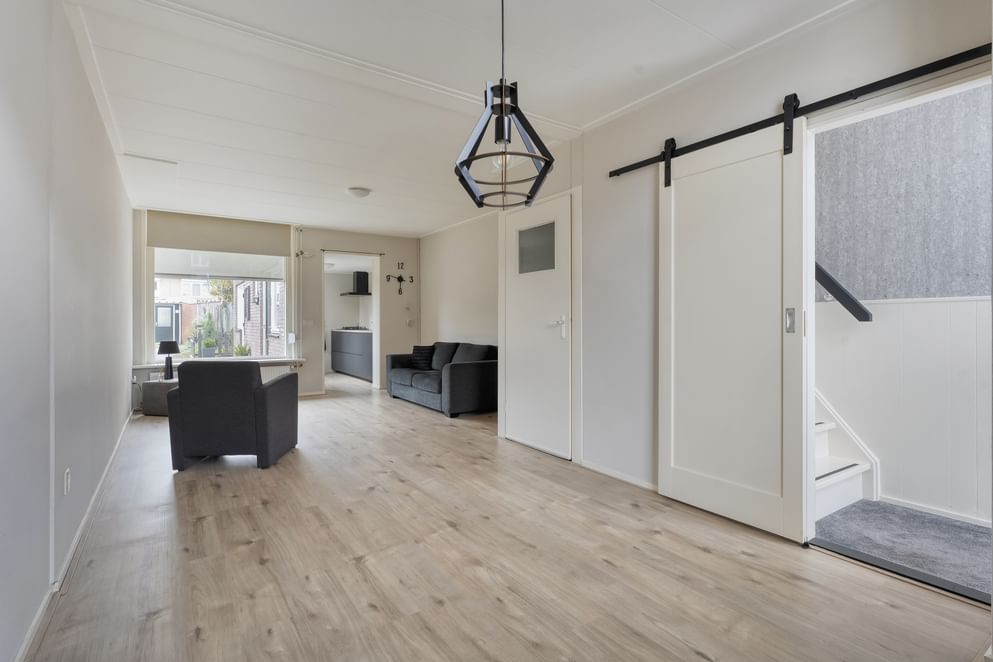 Bij binnenkomst stap je in de hal met toegang tot de ruime woonkamer. Deze is voorzien van veel lichtinval dankzij de grote ramen, en beschikt over een trapkast voor extra opbergruimte. De keuken aan de achterzijde van de woning is in 2022 volledig gemoderniseerd en voorzien van moderne apparatuur. De keuken heeft een strakke uitstraling en is van uitstekende kwaliteit. Achter de keuken bevindt zich de badkamer, uitgerust met een wastafelmeubel, douchecabine, toilet en mechanische ventilatie.