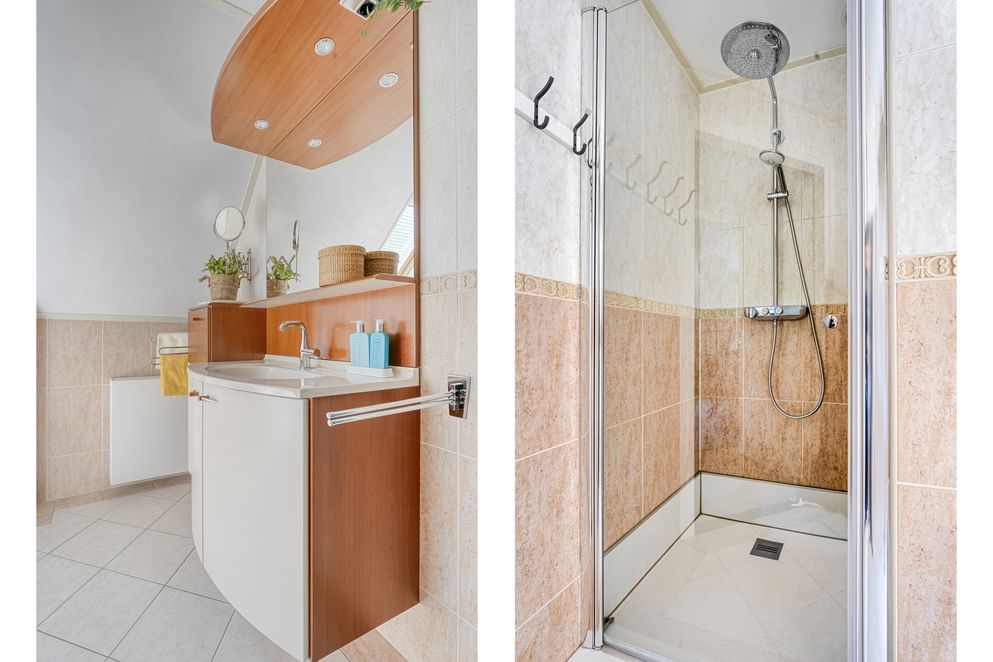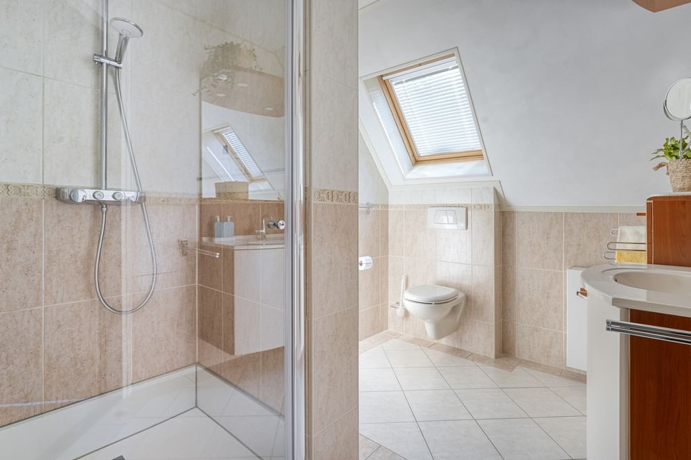 Op de eerste verdieping biedt de overloop toegang tot drie slaapkamers en de badkamer. De hoofdslaapkamer is ruim en beschikt daarnaast over extra kastruimte en airconditioning voor optimaal comfort. De andere twee slaapkamers zijn eveneens goed van formaat. De ruime badkamer is voorzien van een betegelde douchecabine, een wastafel met meubel en een toilet.