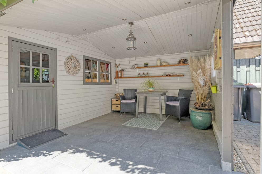 Aan de zijkant van het huis bevindt zich een oprit met carport en ingang. Aan de andere kant van de woning is er een extra oprit, ideaal voor het parkeren van een tweede auto of bijvoorbeeld een caravan.