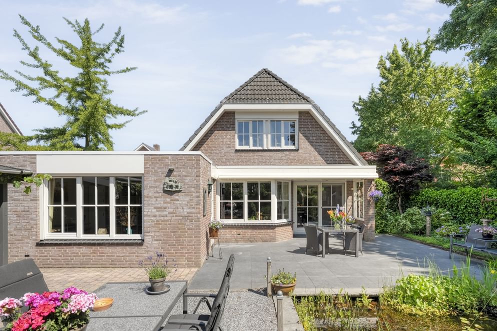 De achtertuin heeft een moderne en open opzet. De sierlijke vijver vormt een sfeervol middelpunt en geeft de tuin een ontspannen uitstraling. Onder de overkapping zit je heerlijk beschut. Ideaal voor een kop koffie in de ochtendzon of een gezellige avond met familie of vrienden.