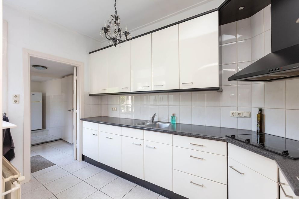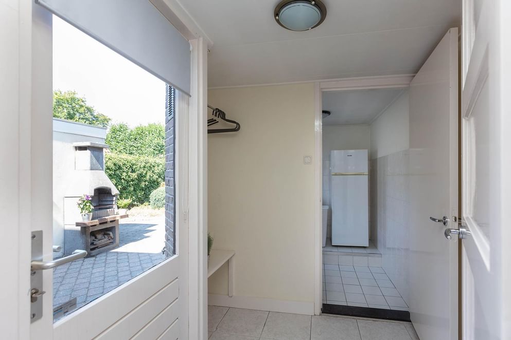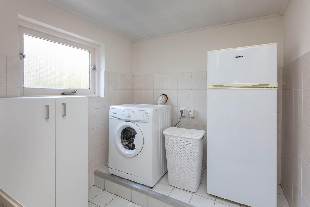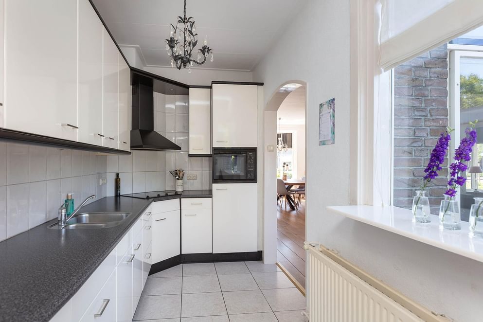 De half open keuken is voorzien van diverse inbouwapparatuur, zoals een keramische kookplaat, oven, 1,5 spoelbak, vaatwasser en koelkast. Wanneer je doorloopt vanuit de keuken, kun je in het achter portaal extra bergruimte vinden en de witgoedaansluitingen. Ook heb je van hieruit toegang tot de achtertuin.