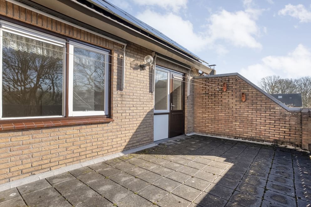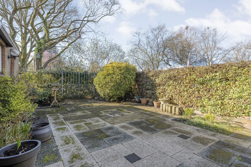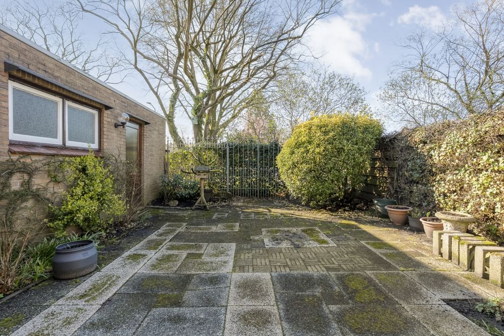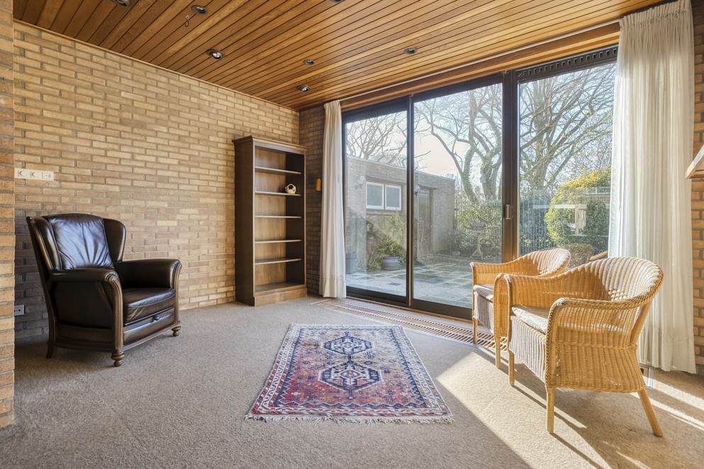 Via de schuifpui bereik je de tuin. Daarnaast is er vanuit de keuken een overdekte doorgang naar de tuin en de garage.
