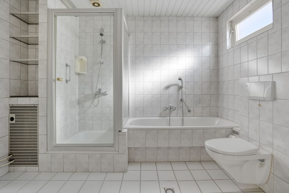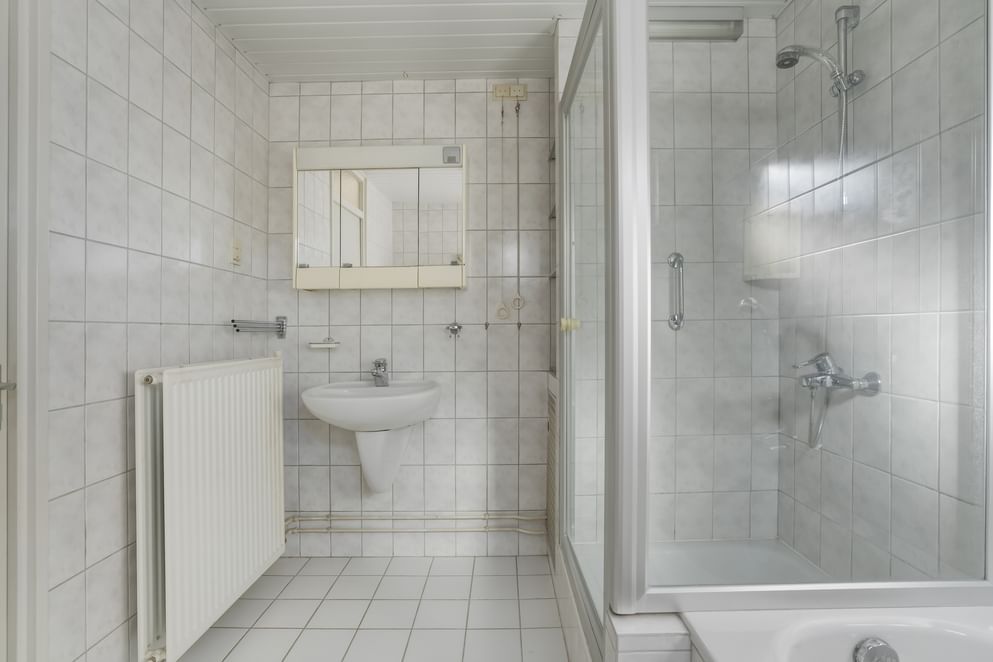 De badkamer is compleet uitgevoerd en beschikt over een ligbad, douche, toilet en wastafel
